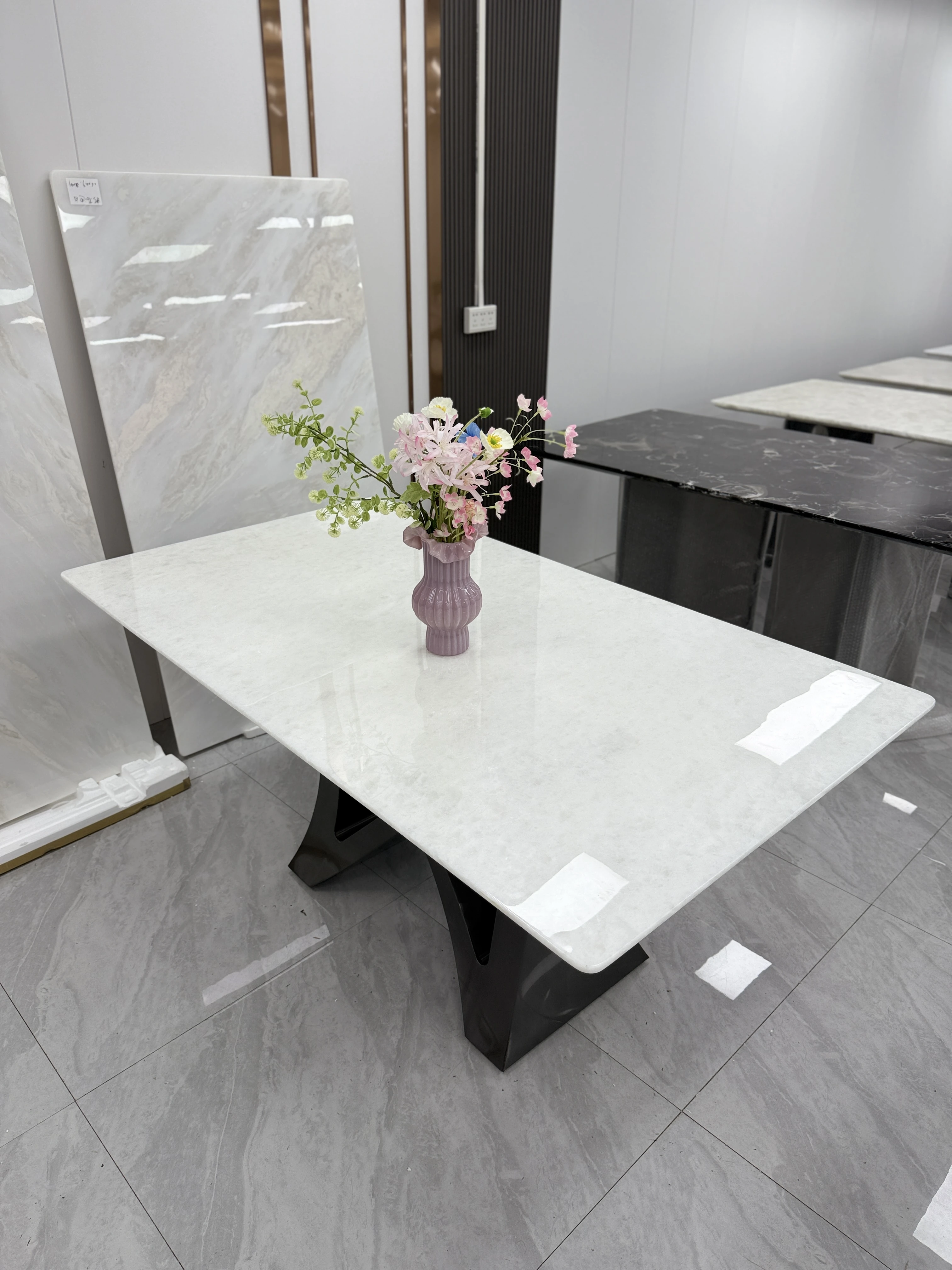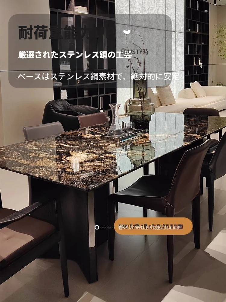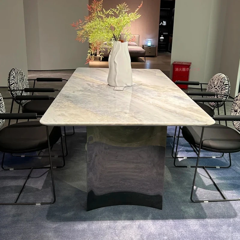 2025年版イタリアンミニマル天然石製高級ダイニングテーブルセット - プラチナダイヤモンド仕上げの長方形大理石テーブルで、ラグジュアリーな別荘の食事空間を演出!
