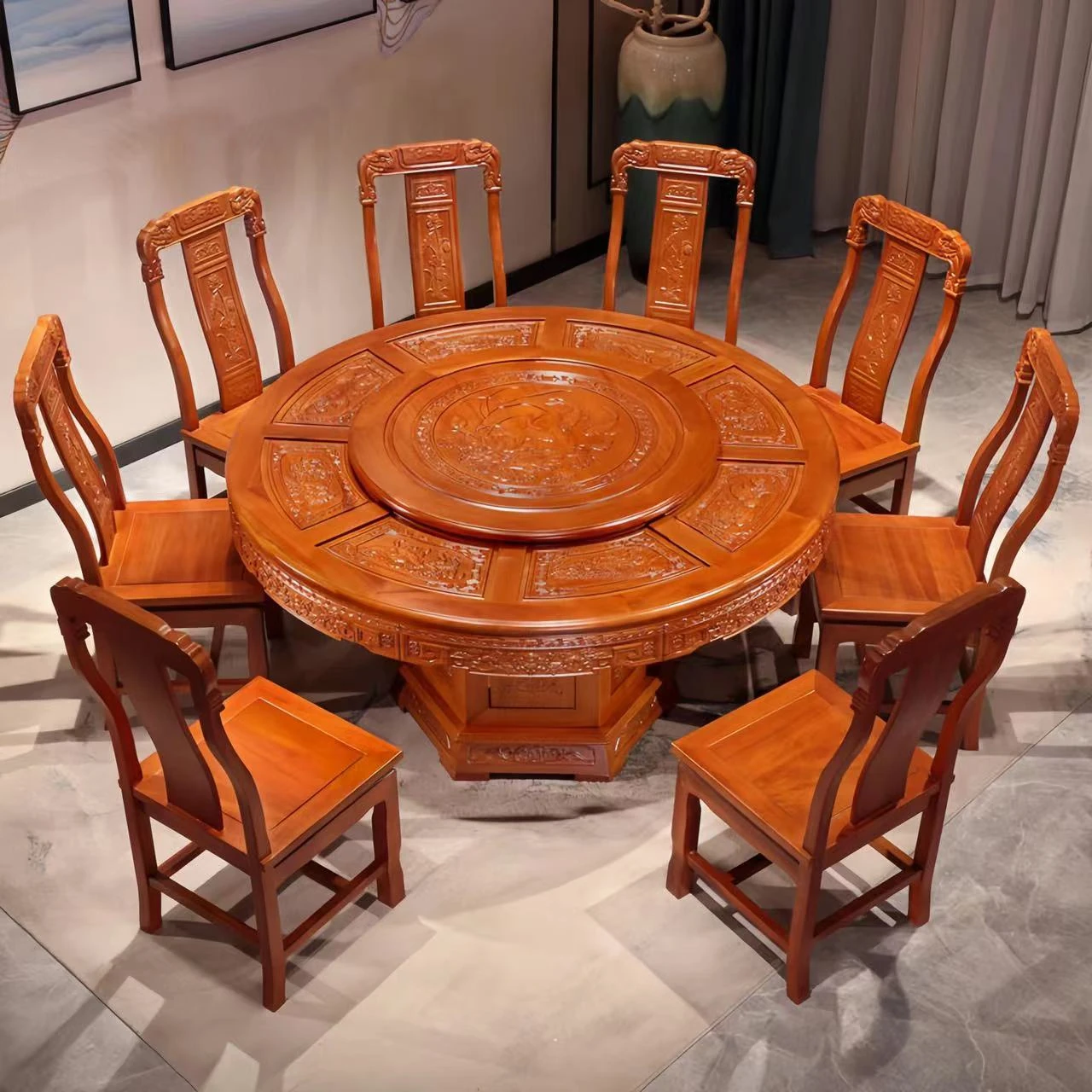 HF2Xアフリカンマホガニー製の新中式彫刻円形ダイニングテーブル、回転盤付きの家庭用食卓セット、洗練されたデザインでおしゃれな食事空間を演出!