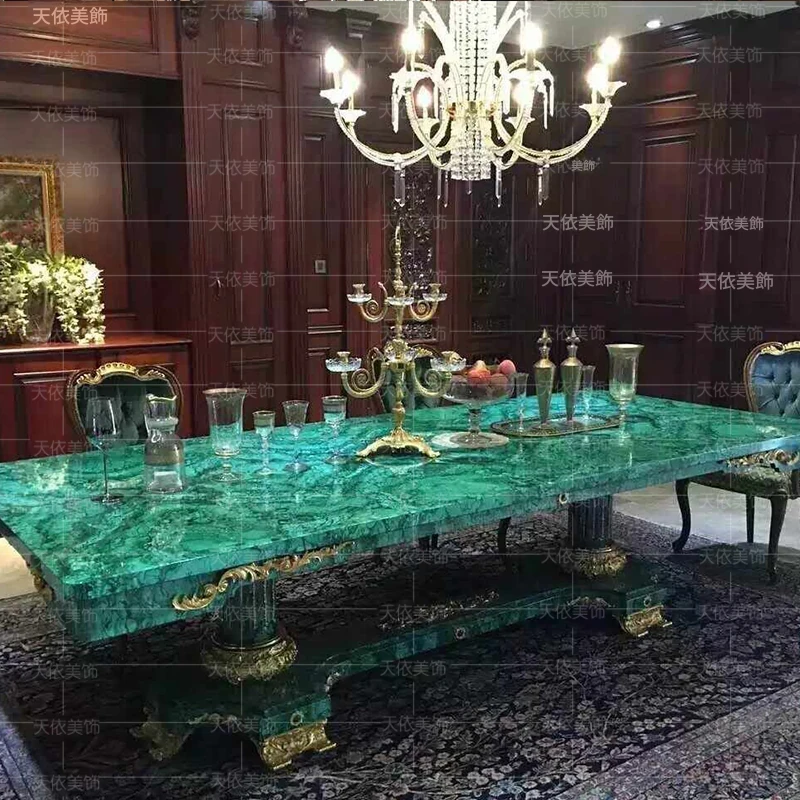 豪華な孔雀緑の大理石製長テーブル - ヨーロピアンスタイル、10人用、別荘や宮廷にぴったりな高級ダイニングテーブル。洗練されたデザインで、あなたの食卓を華やかに演出します!