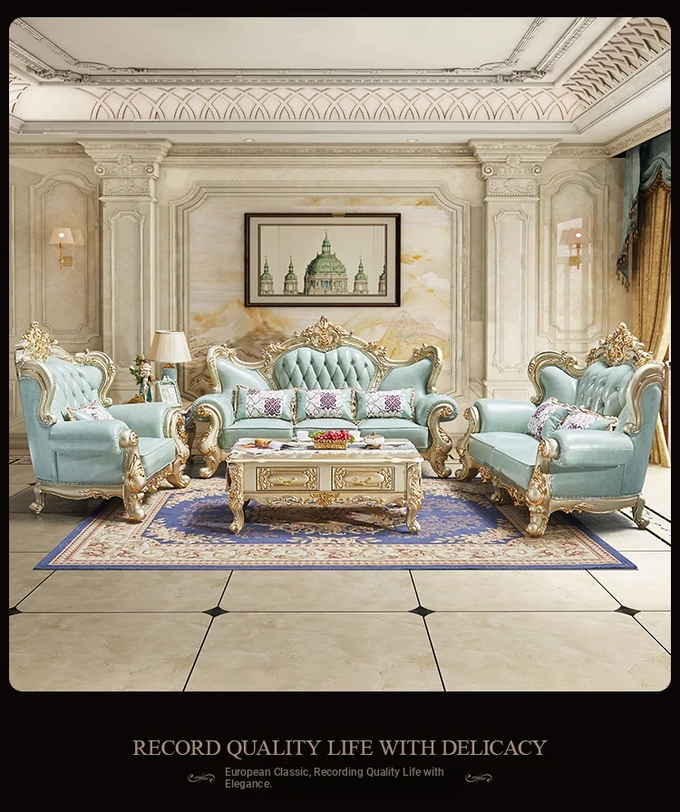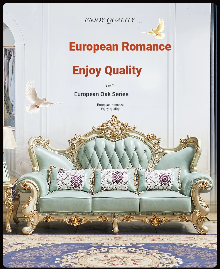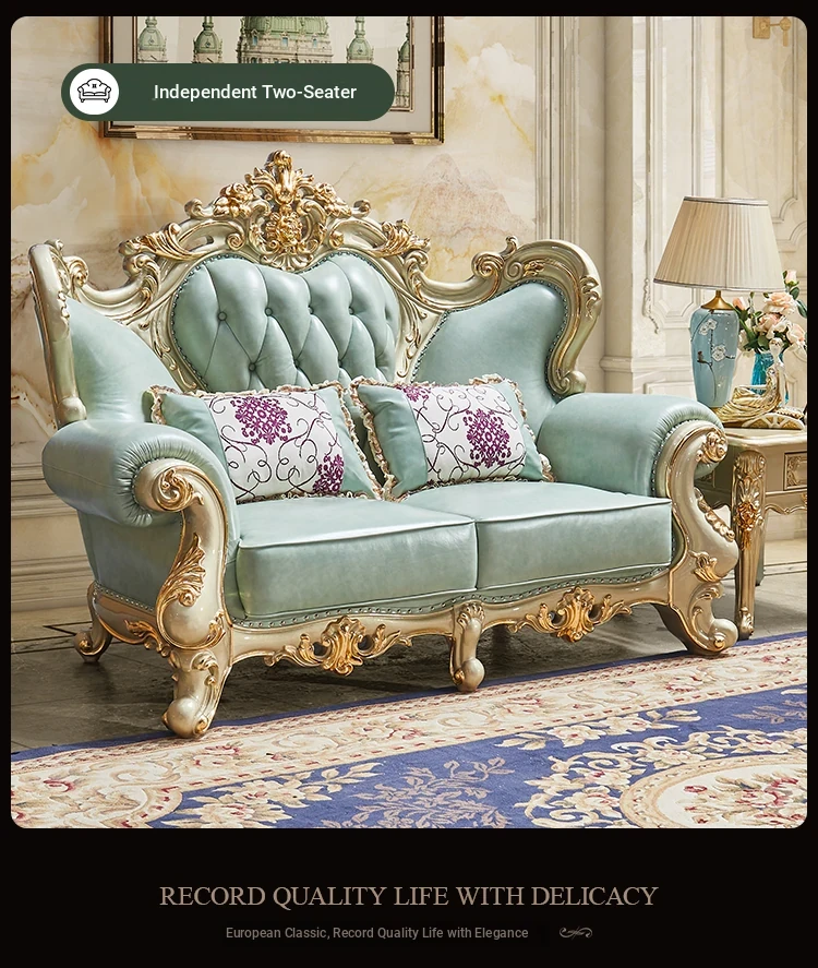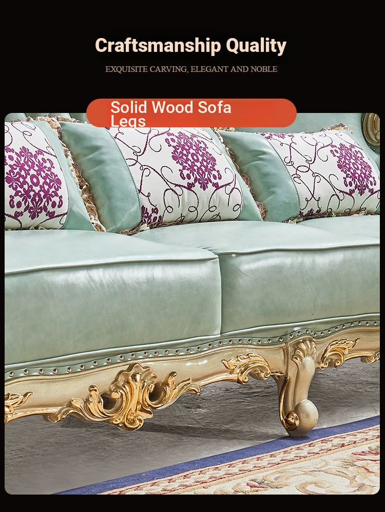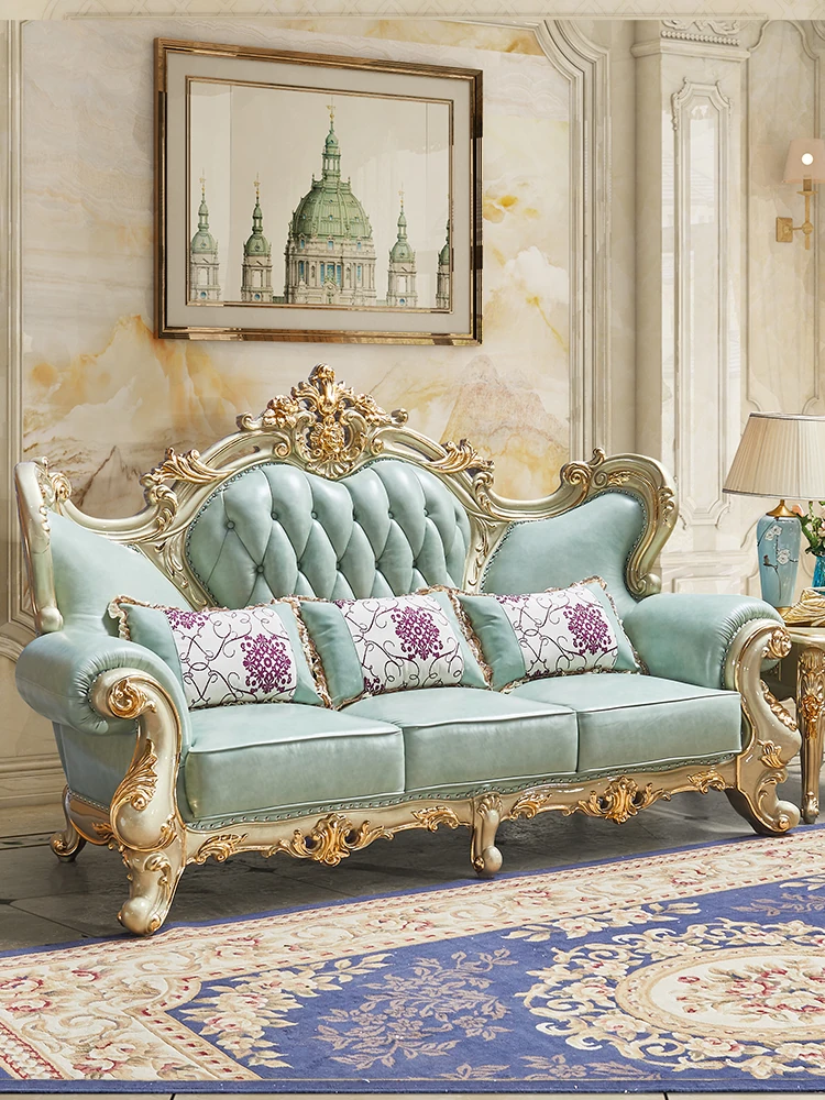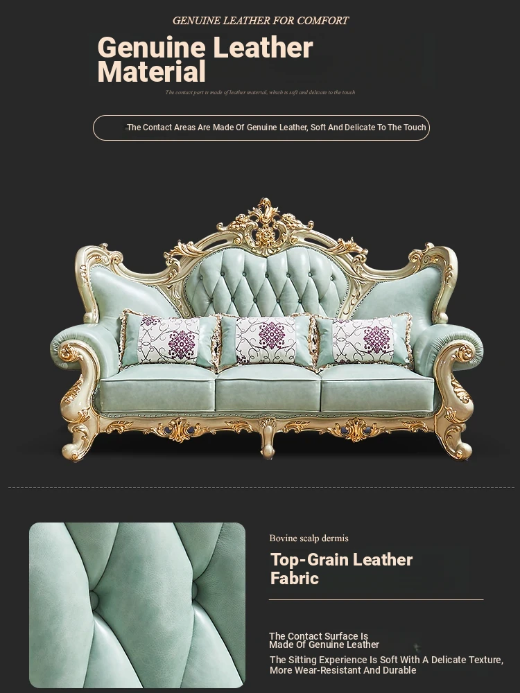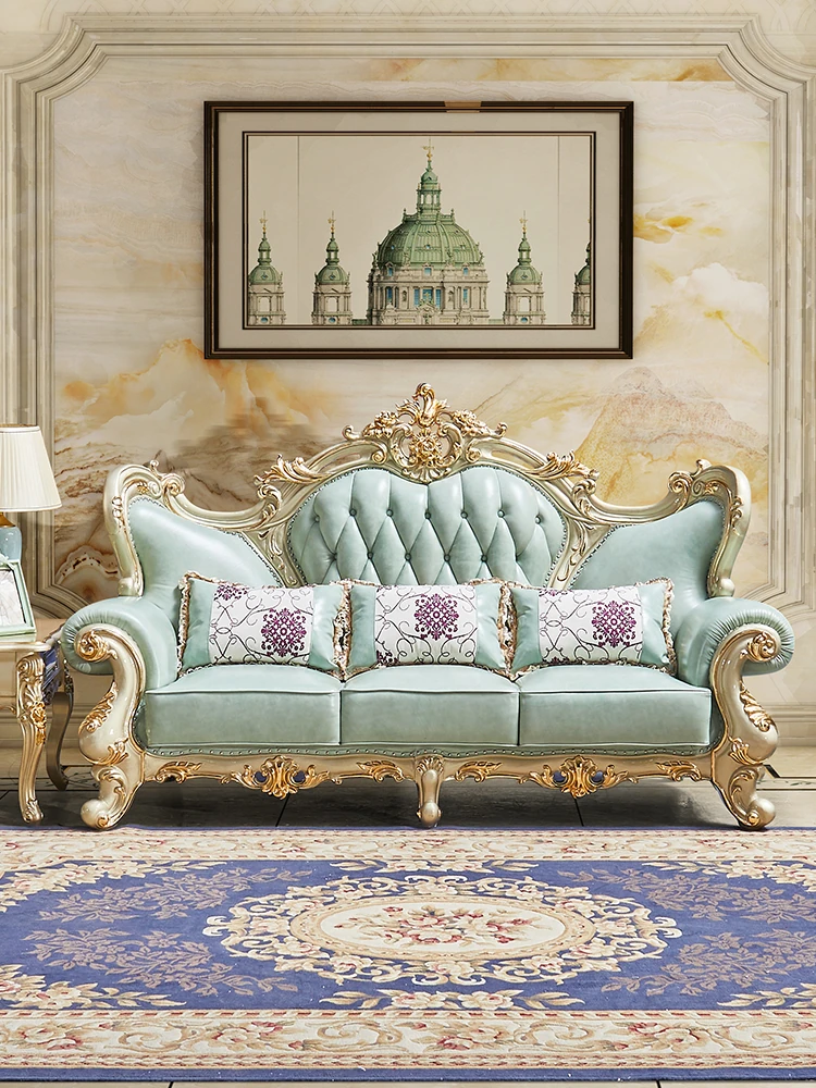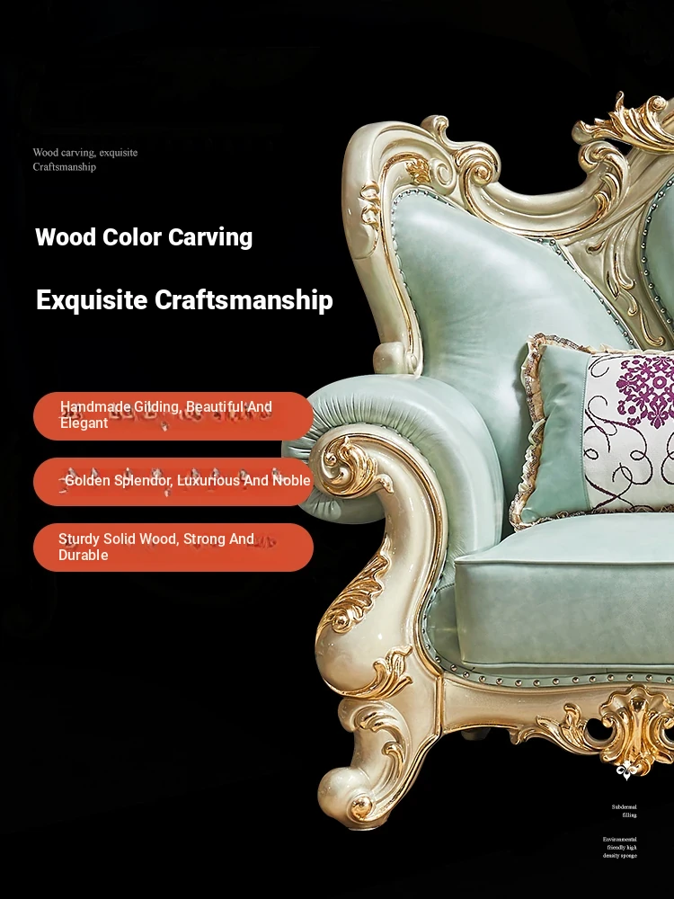 Elegant European-Style Luxury Villa Sofa Set - 1+2+3 Piece Solid Wood Carved Design with Premium Genuine Leather for Cozy Small Living Rooms