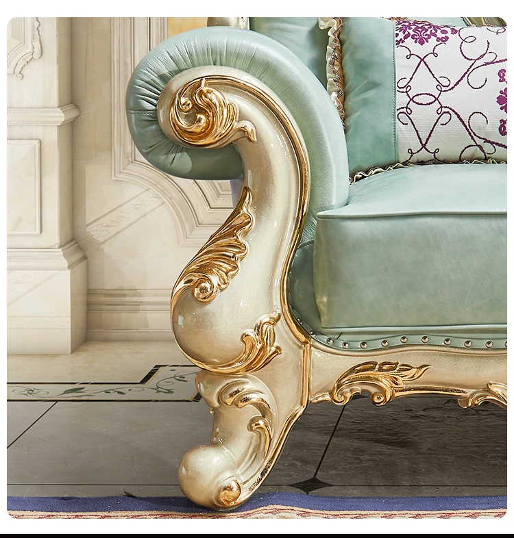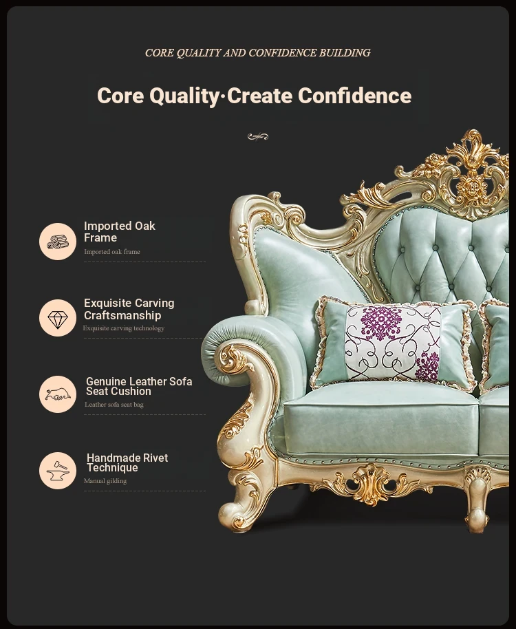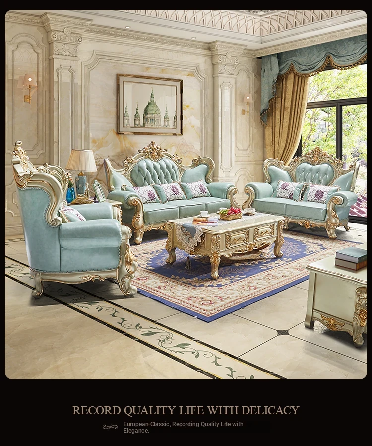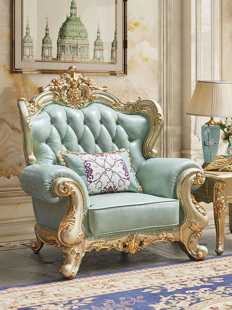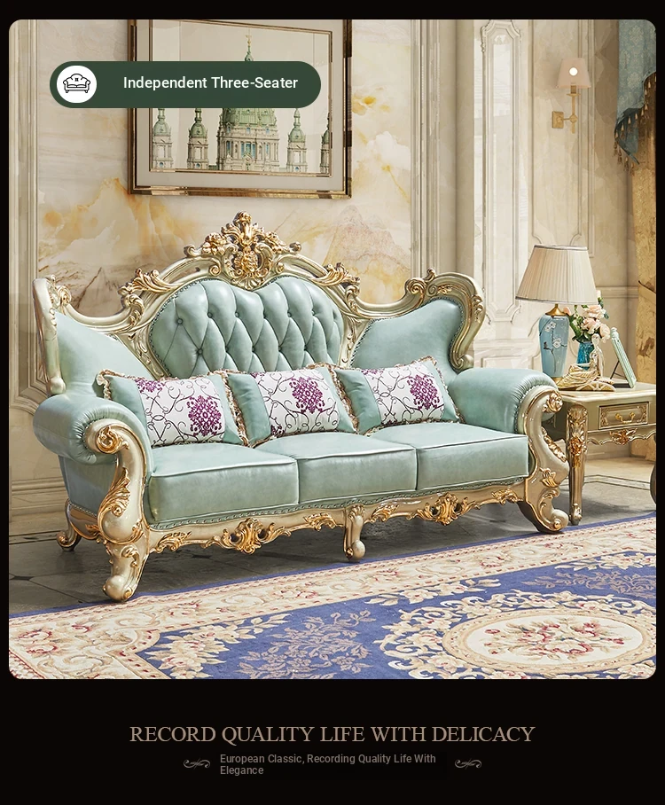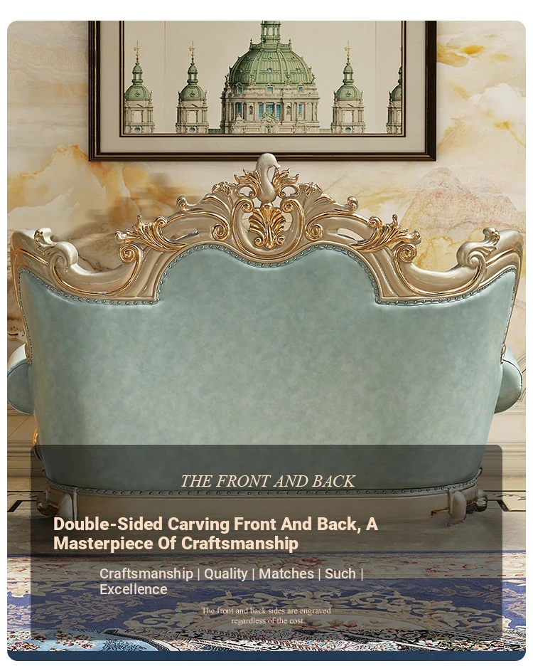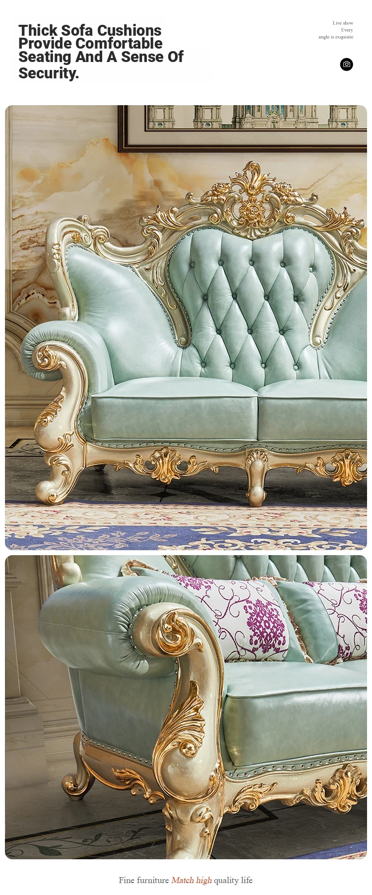 Elegant European-Style Luxury Villa Sofa Set - 1+2+3 Piece Solid Wood Carved Design with Premium Genuine Leather for Cozy Small Living Rooms