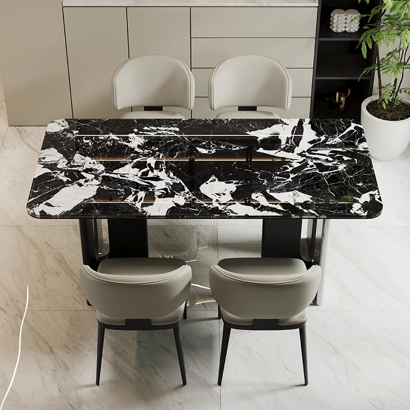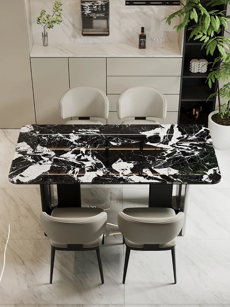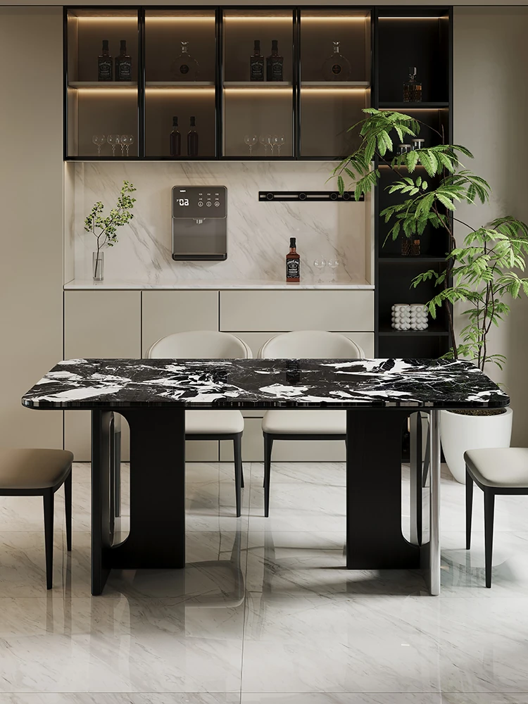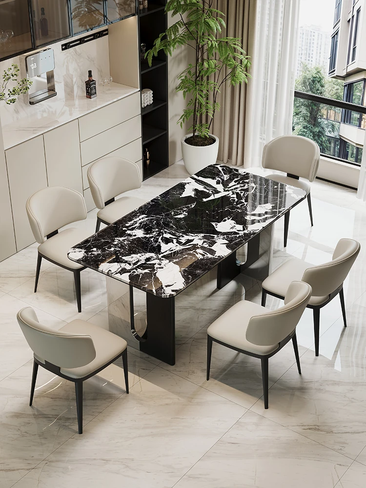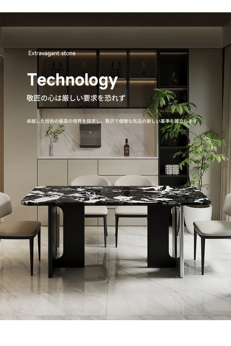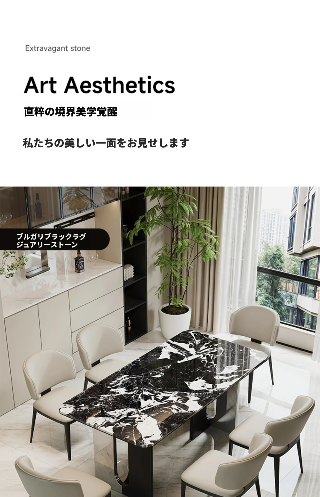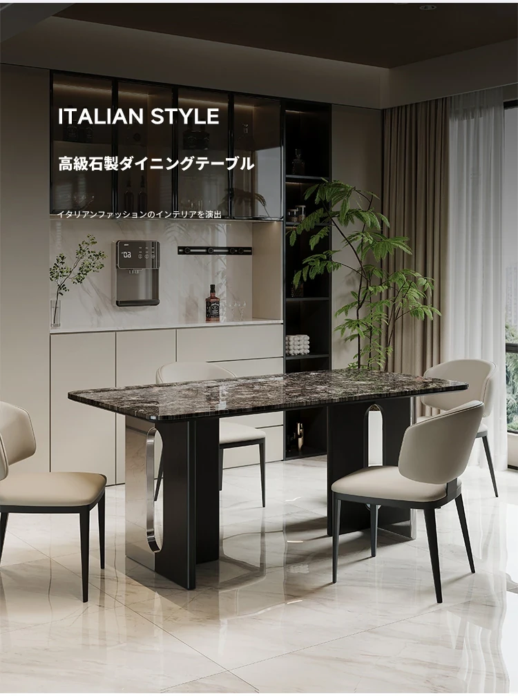 2025年新作!黒いバルガリー大理石ダイニングテーブル - ラグジュアリー感溢れる現代的でシンプルな長方形家庭用テーブルと椅子セット。おしゃれな食卓で特別なひとときを!