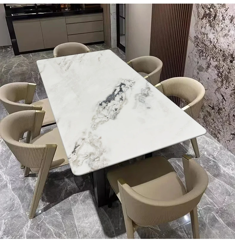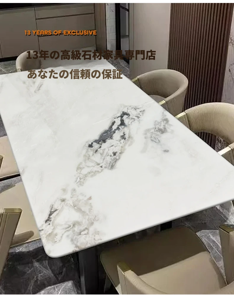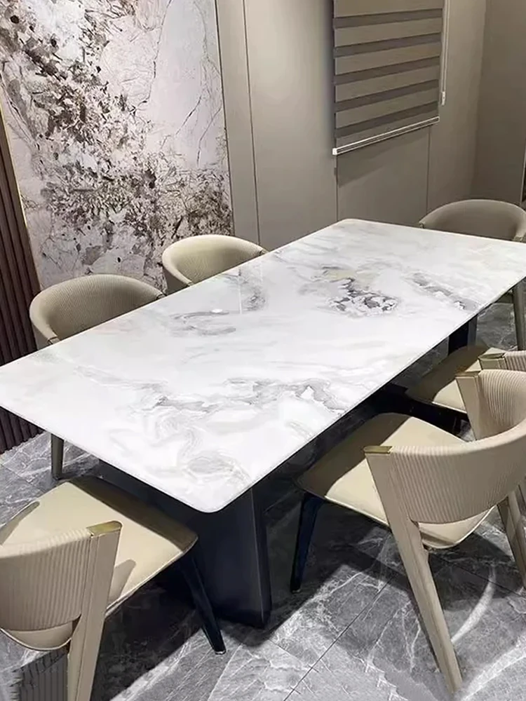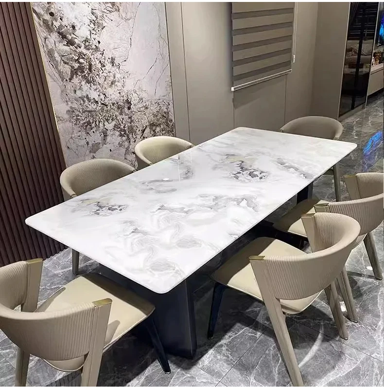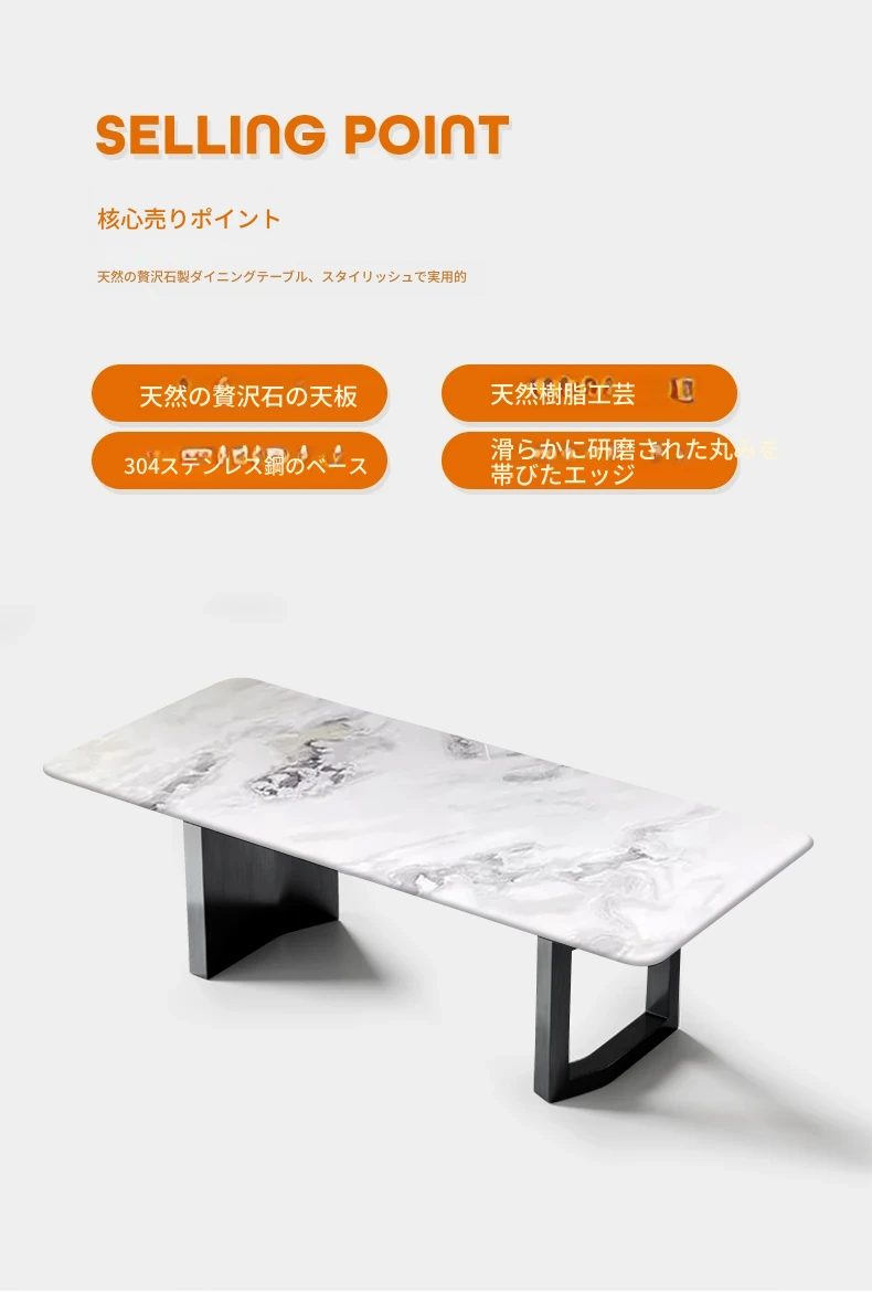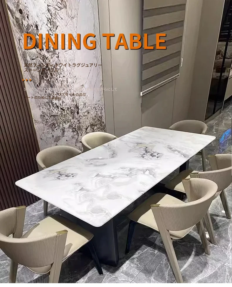 天然フィンディホワイトラグジュアリー石製ダイニングテーブル - モダンでシンプルな高級感、別荘にぴったりの長方形大理石テーブル&チェアセット!上質な食事空間を演出します。