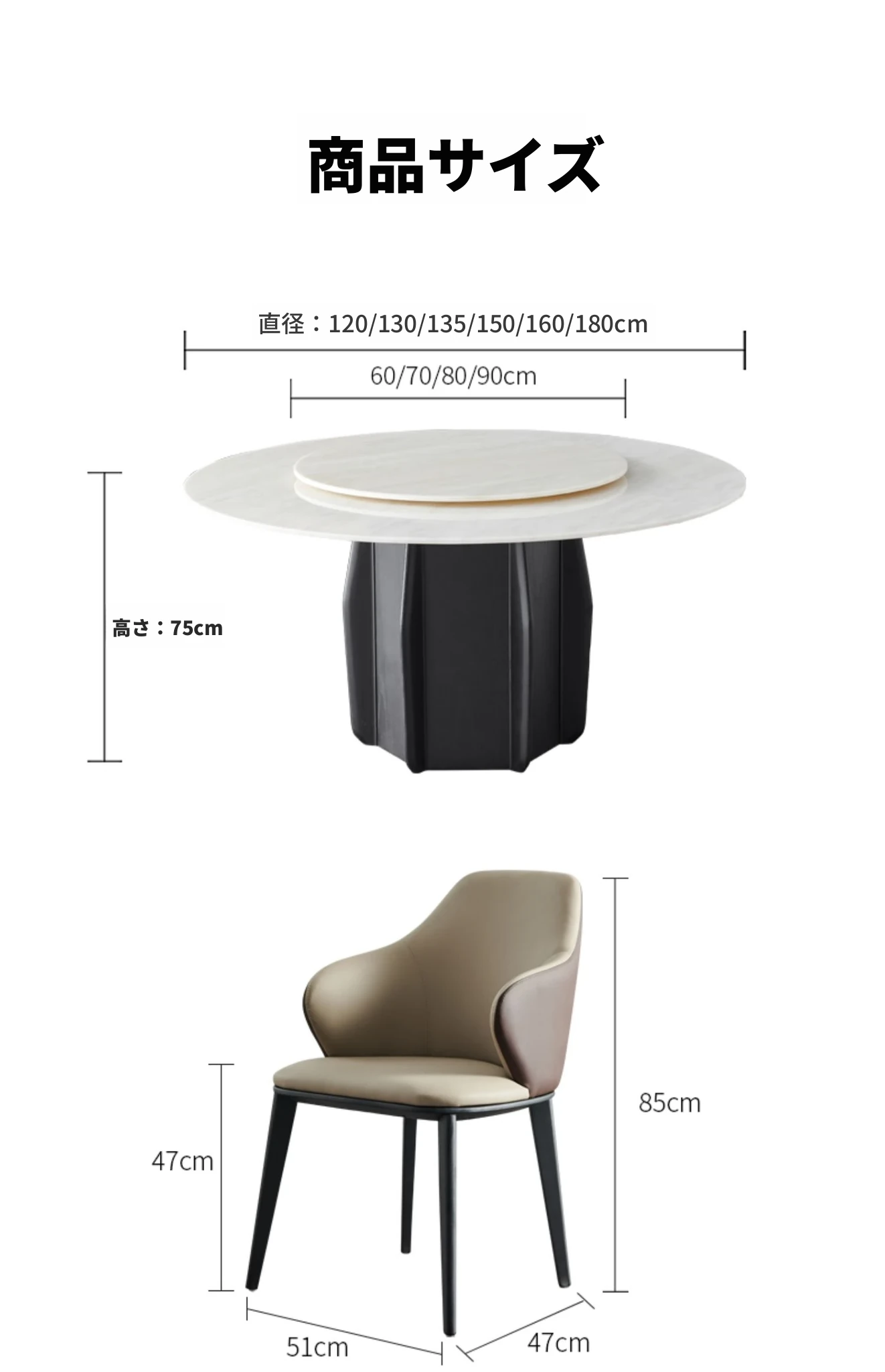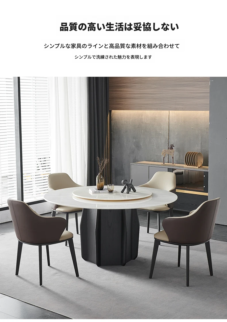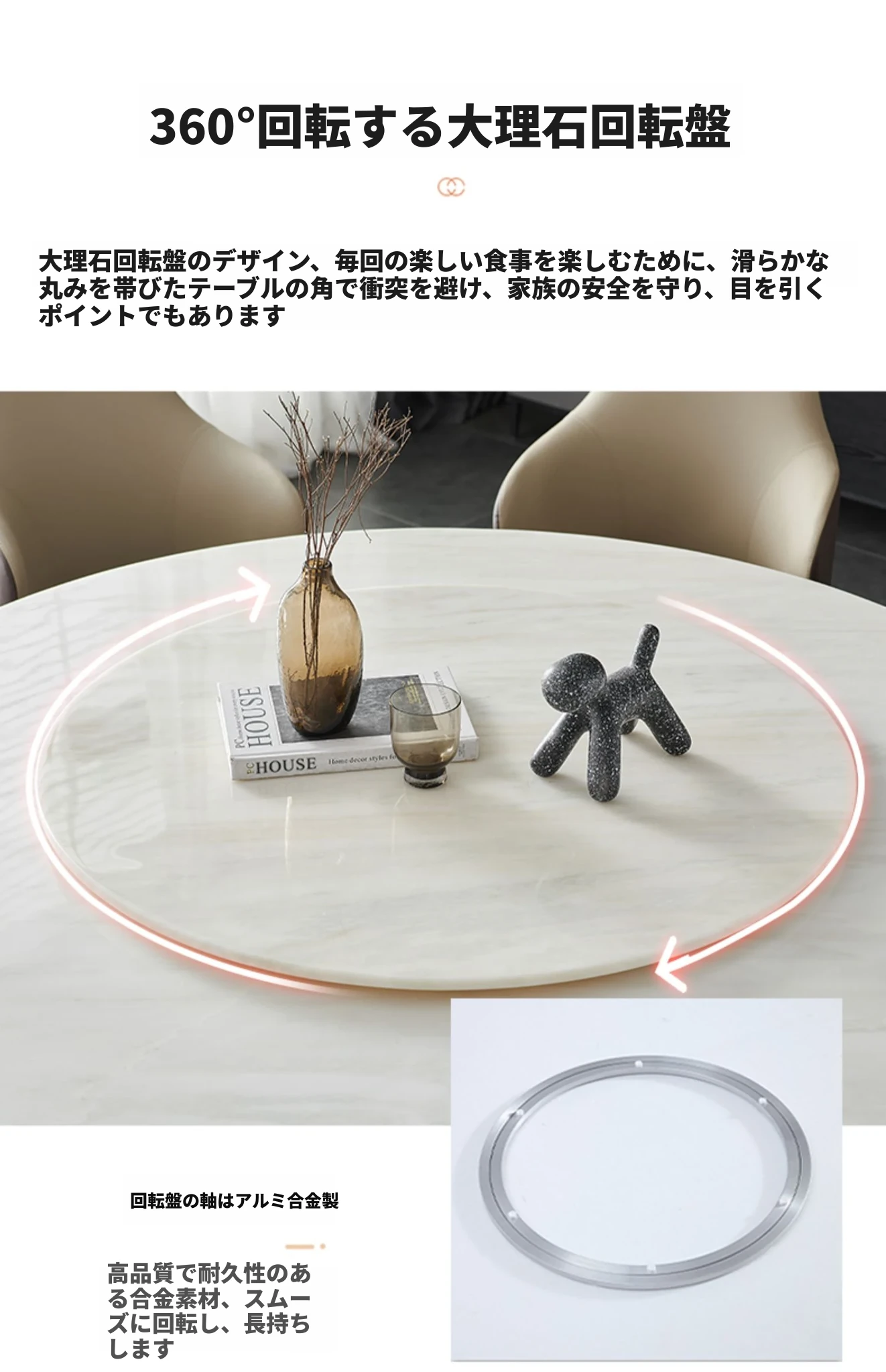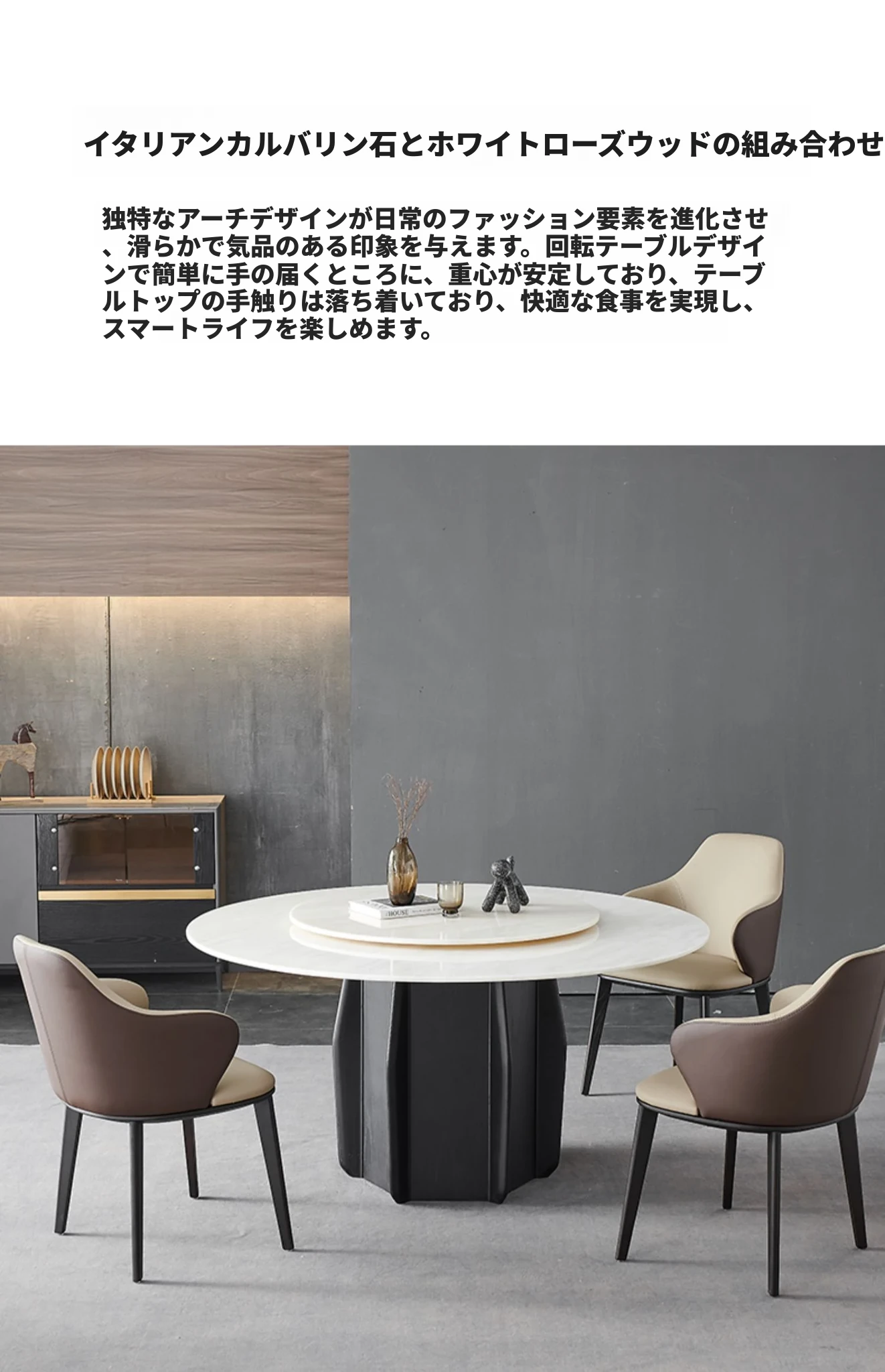 天然大理石と無垢材を使用したモダンでシンプルなラウンドダイニングテーブルセット。回転式デザインで軽やかな贅沢感を演出!食卓を華やかに彩る高級感溢れる一品です。
