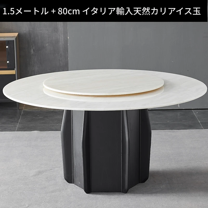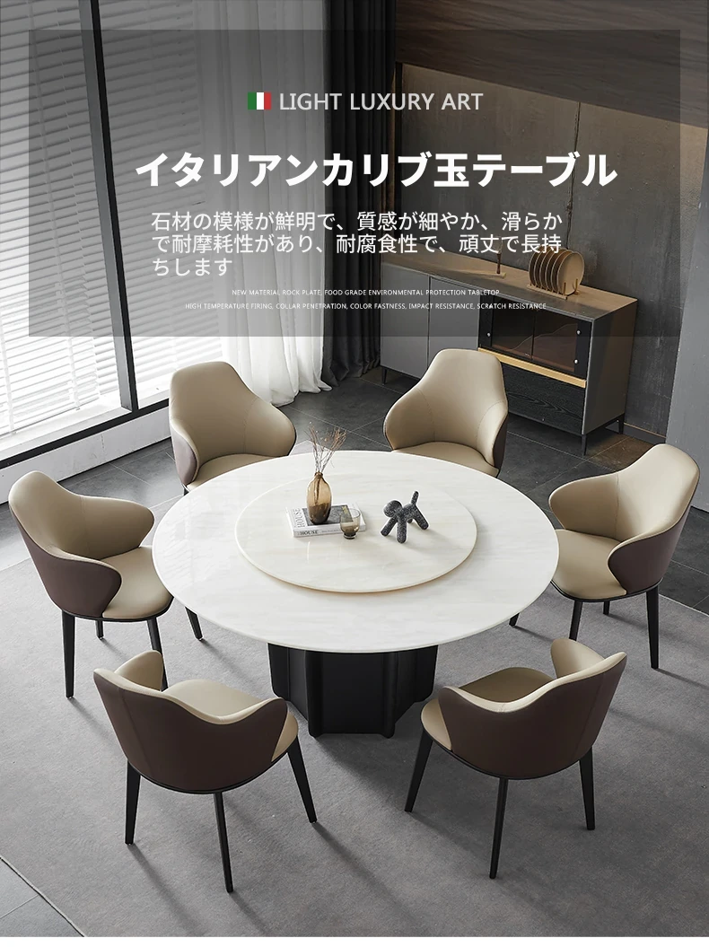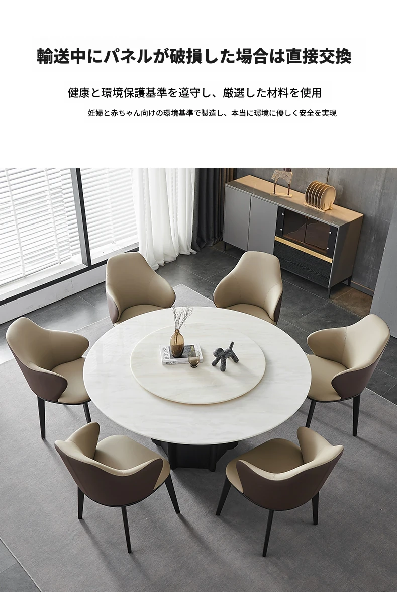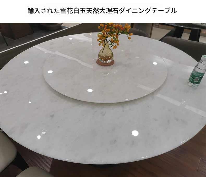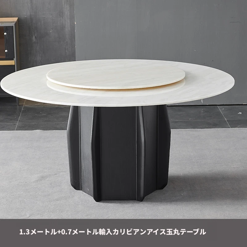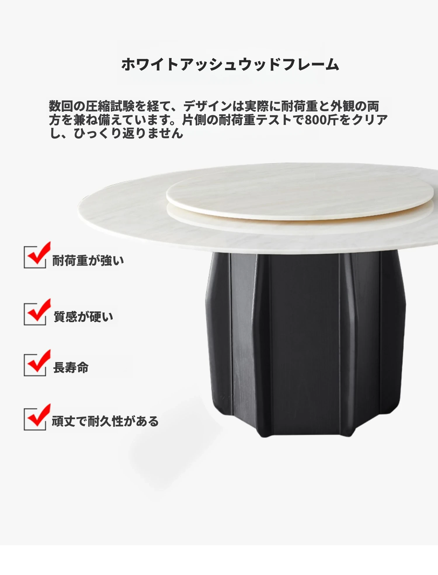天然大理石と無垢材を使用したモダンでシンプルなラウンドダイニングテーブルセット。回転式デザインで軽やかな贅沢感を演出!食卓を華やかに彩る高級感溢れる一品です。