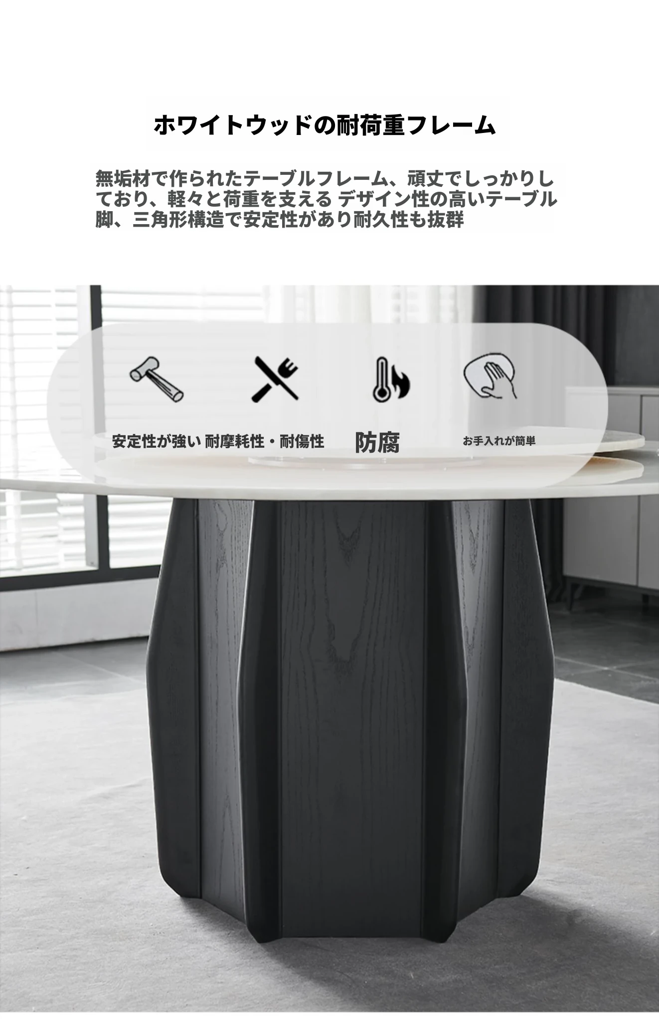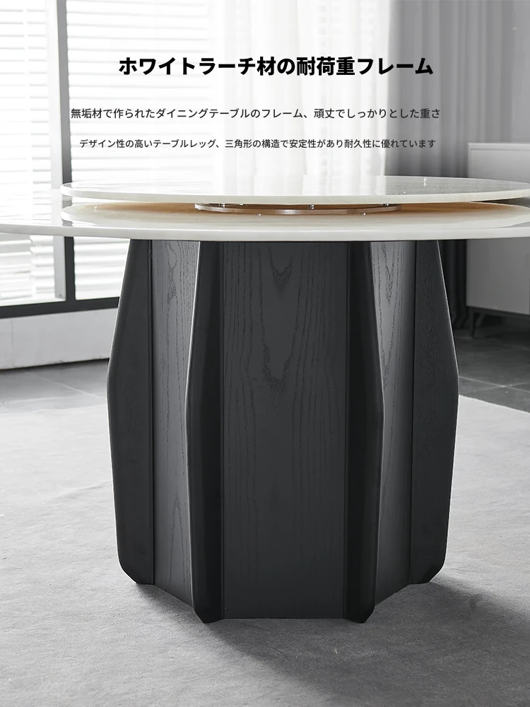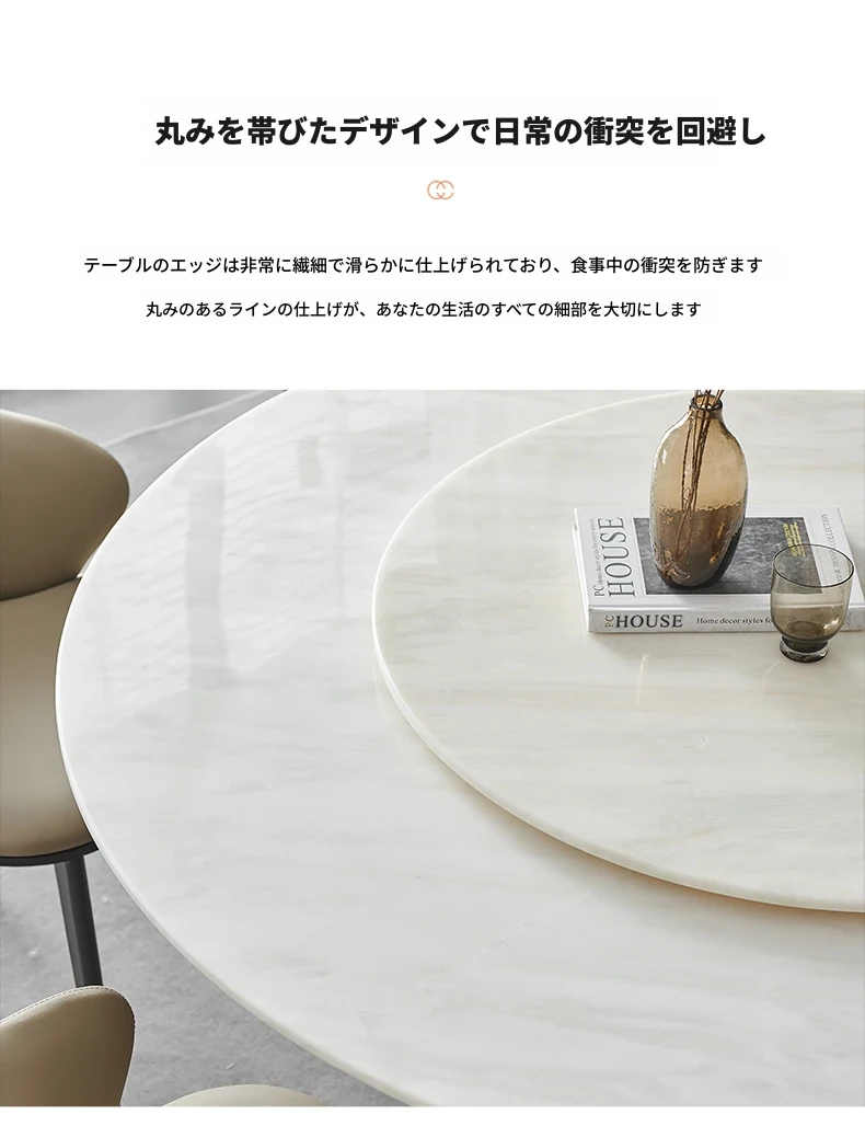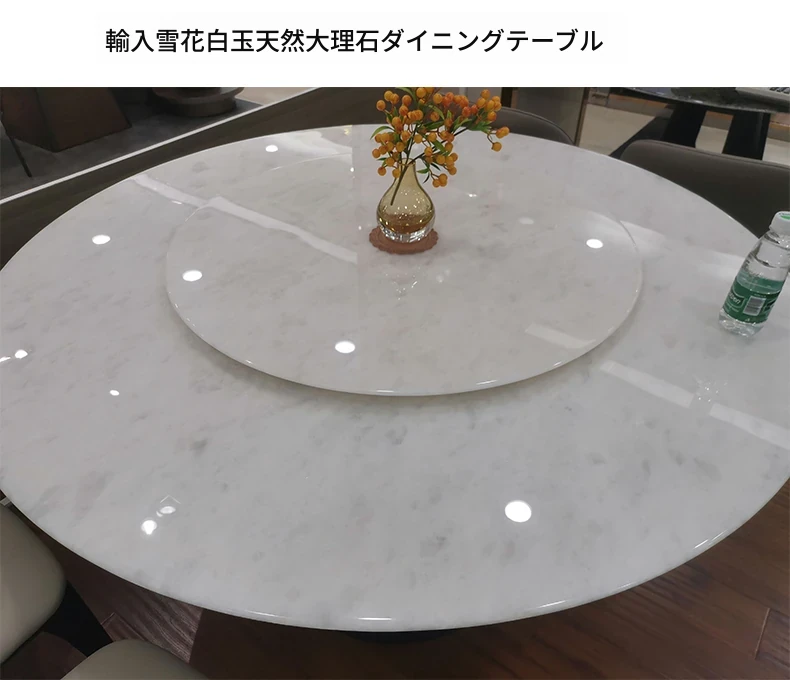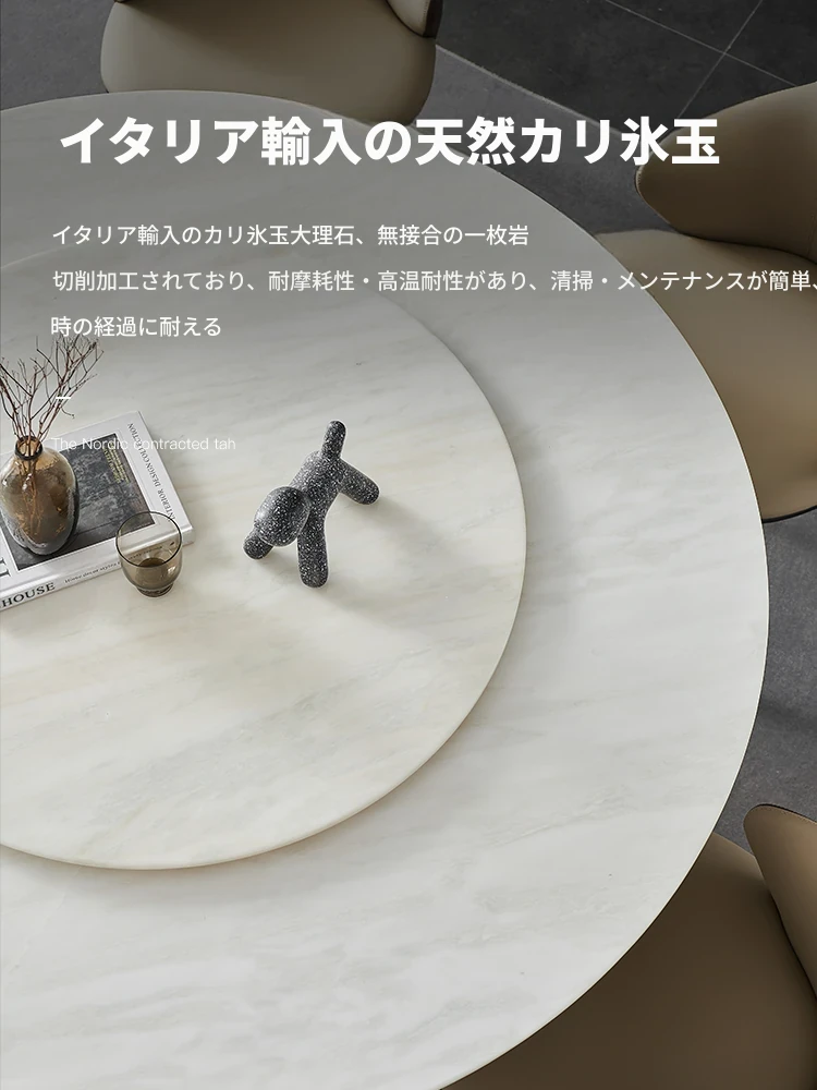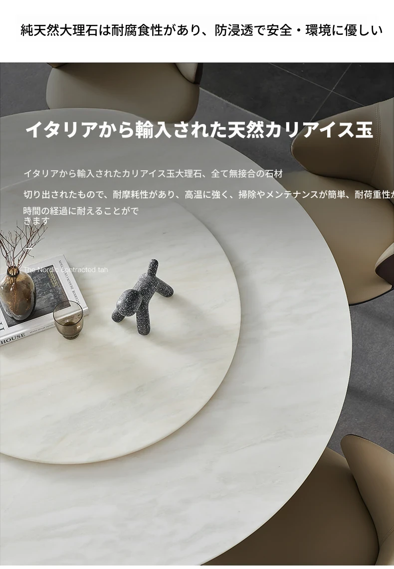 天然大理石と無垢材を使用したモダンでシンプルなラウンドダイニングテーブルセット。回転式デザインで軽やかな贅沢感を演出!食卓を華やかに彩る高級感溢れる一品です。