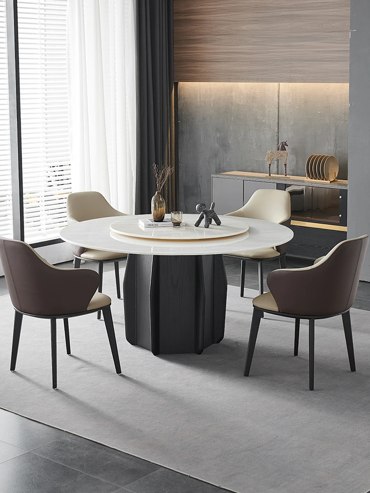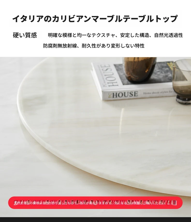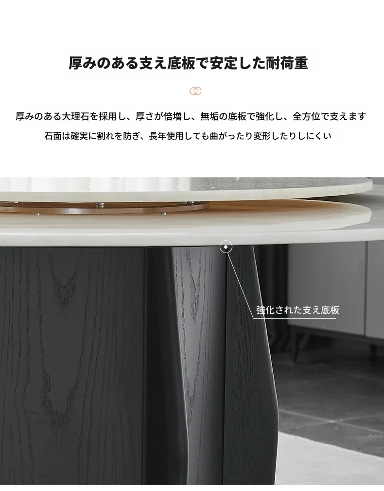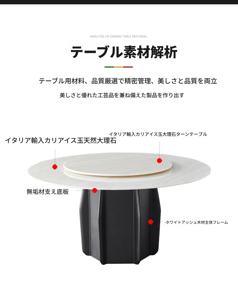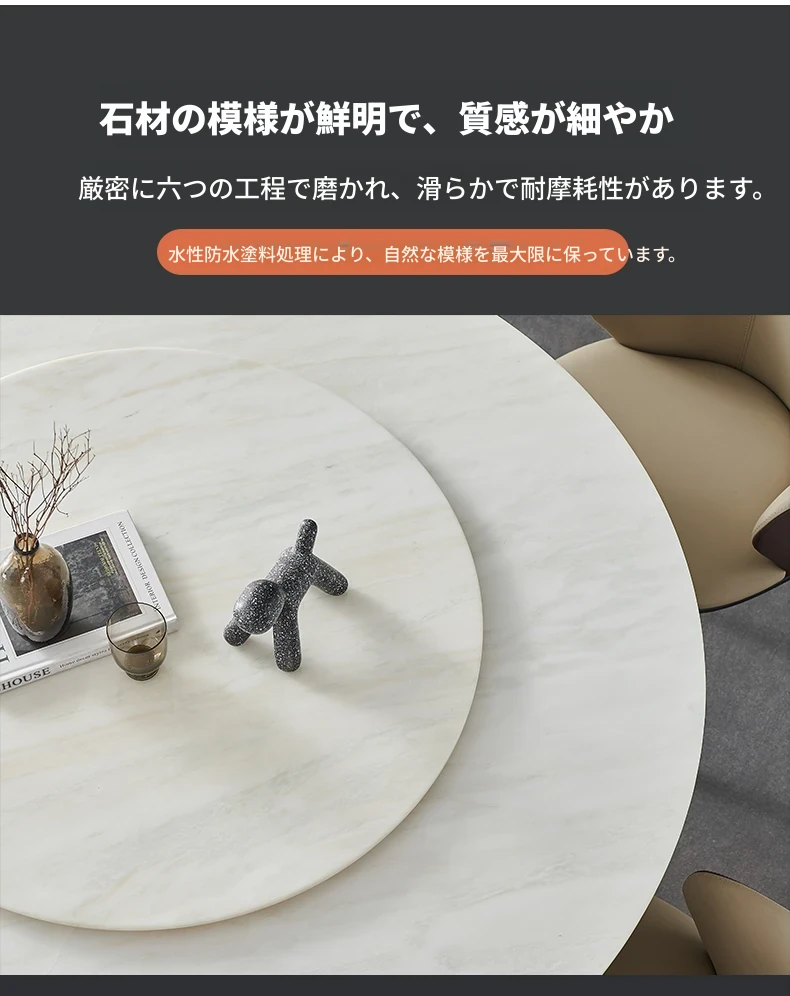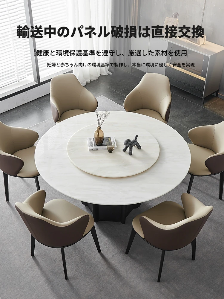 天然大理石と無垢材を使用したモダンでシンプルなラウンドダイニングテーブルセット。回転式デザインで軽やかな贅沢感を演出!食卓を華やかに彩る高級感溢れる一品です。