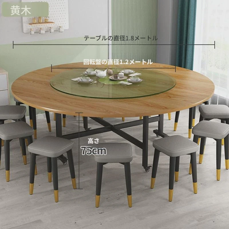 1.8メートル黄木目+1.2メートル強化ガラス回転台+12角スツール