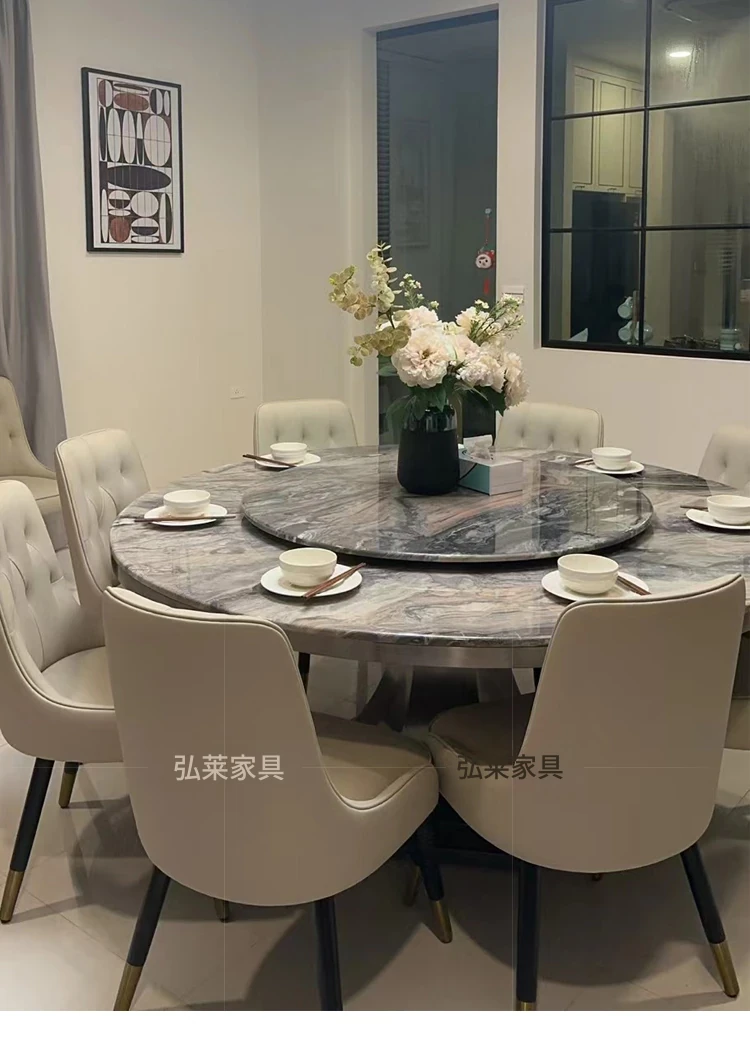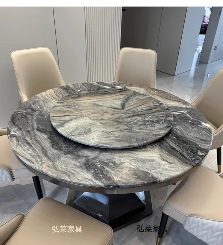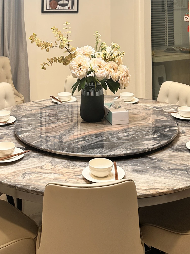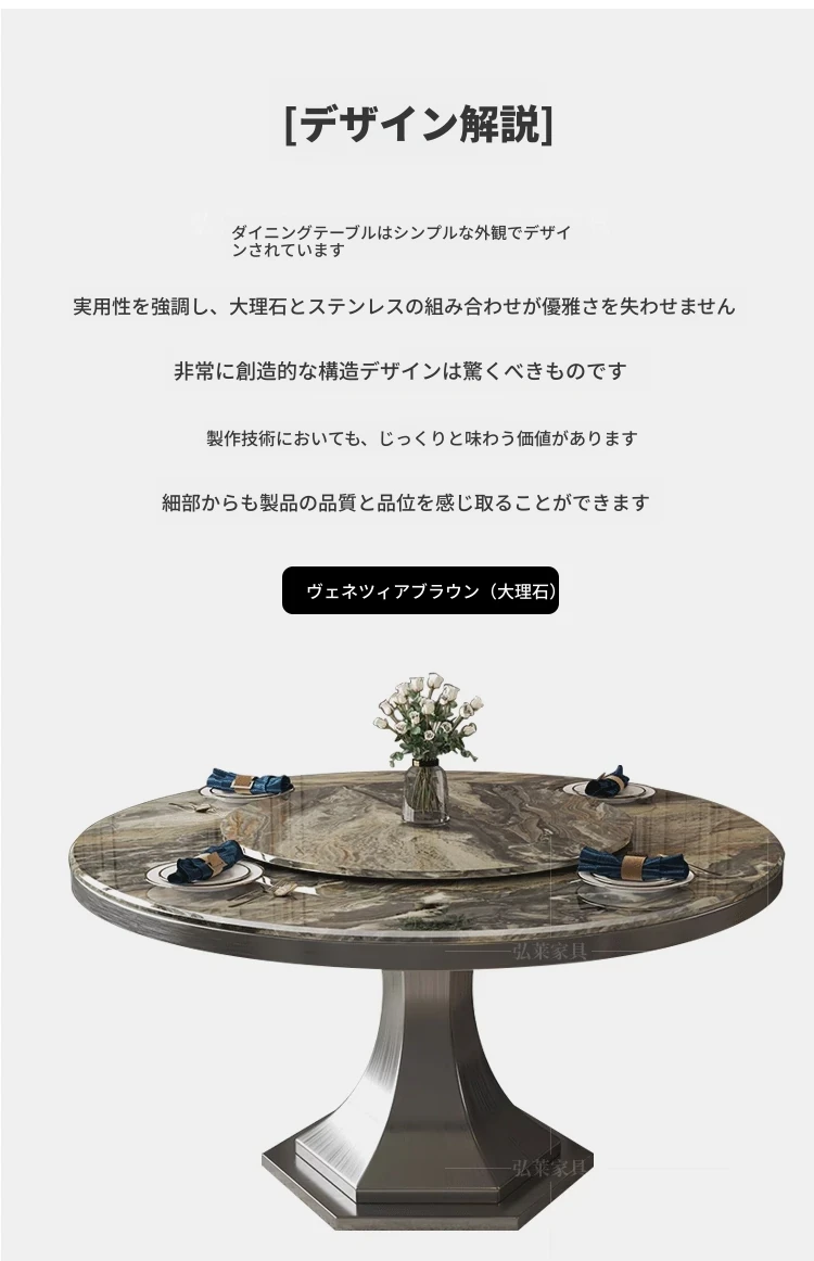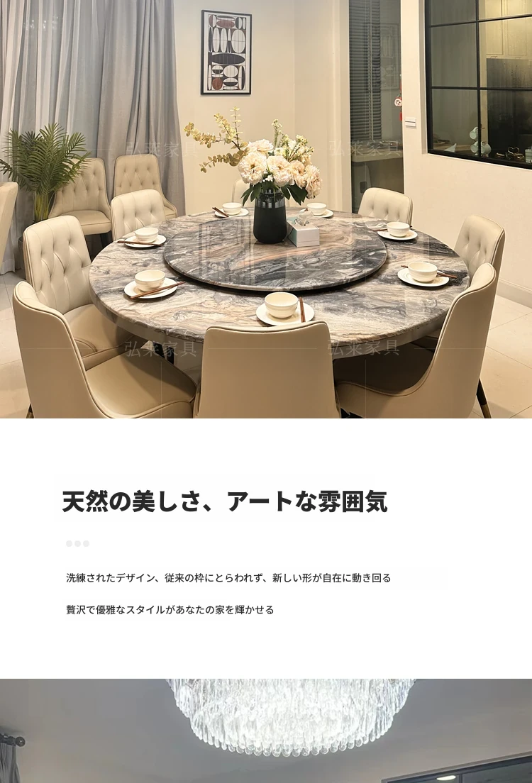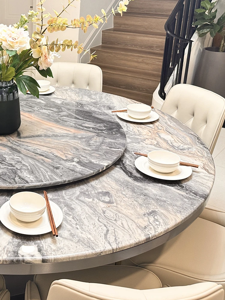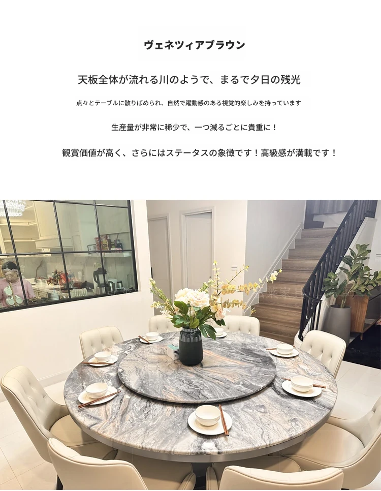高級イタリアンデザインの大理石円形ダイニングテーブル - 回転式プレート付き、輸入天然石の優雅さを追求したモダンシンプルスタイル、ベネチアンブラウンの美しいラウンドテーブルで特別な食事を演出!