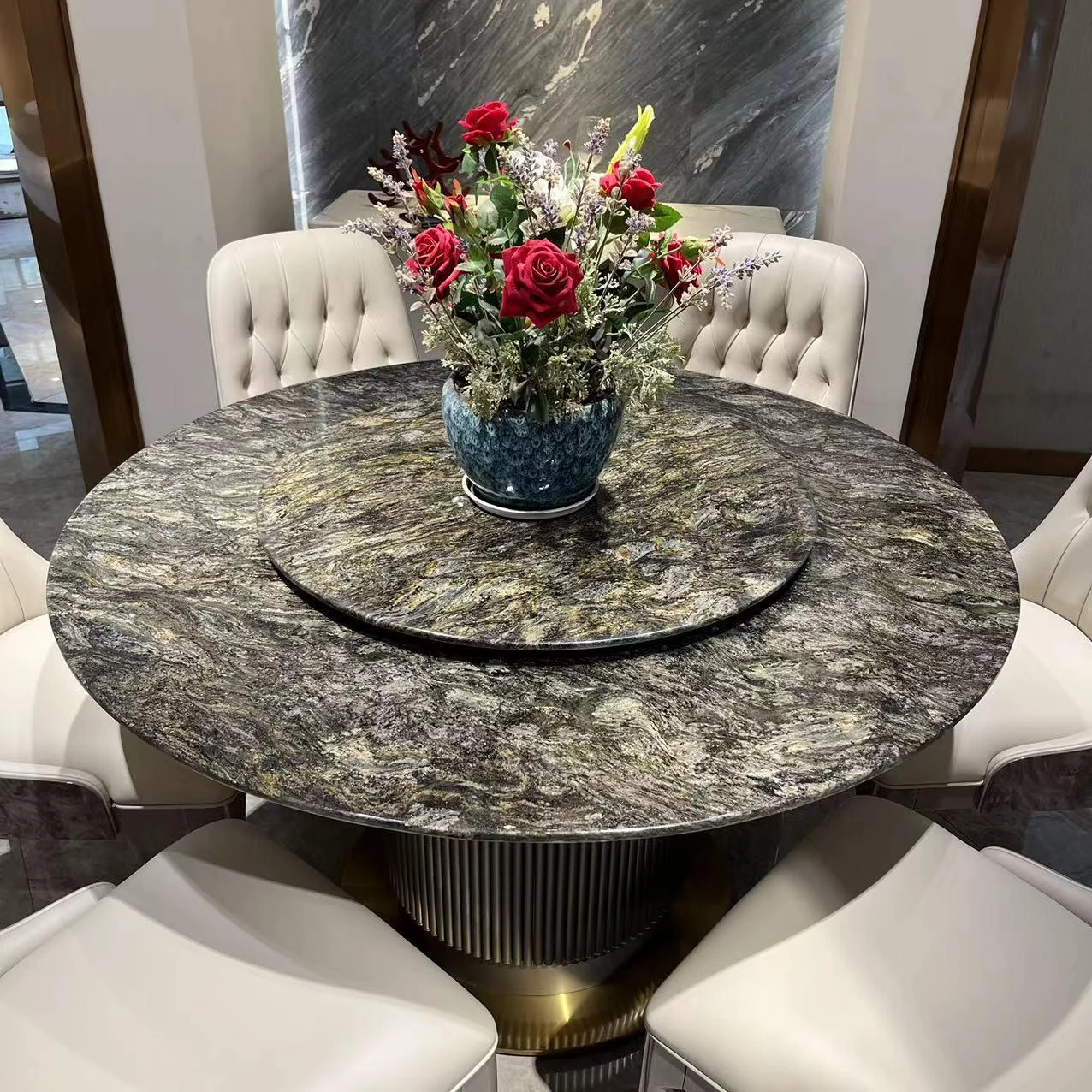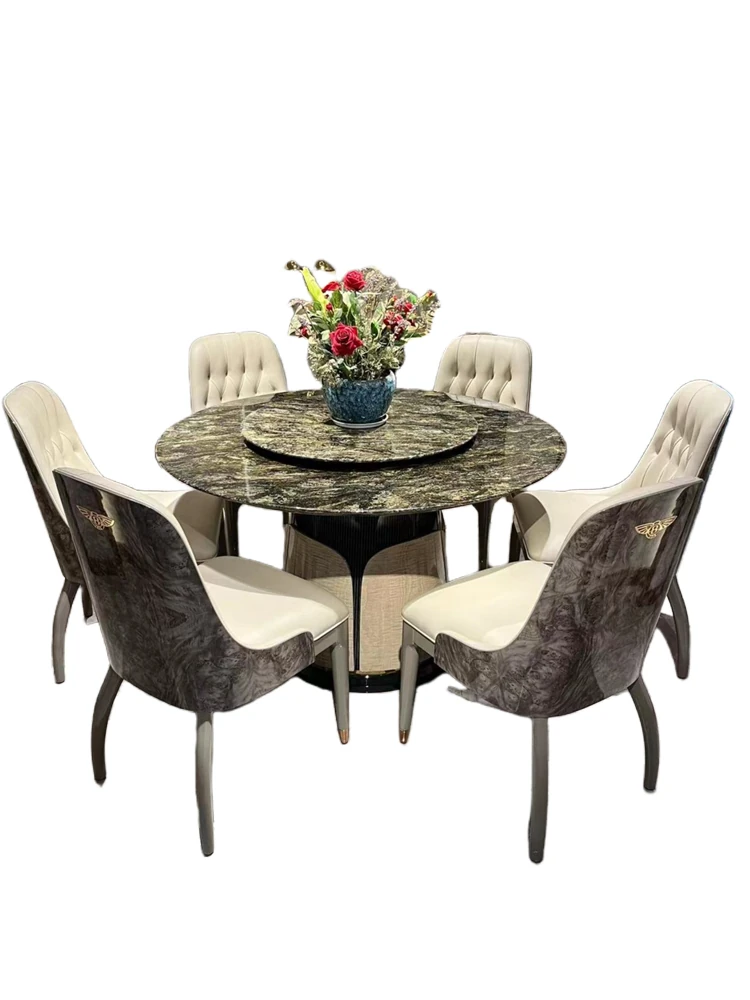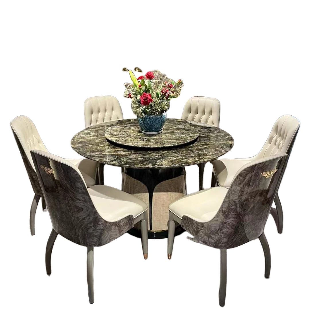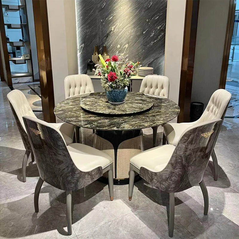 イタリアン・ラグジュアリー モダンデザイン 大型ラウンドテーブル 高級別荘向け エメラルドグリーンの天然石使用 豪華ダイニングテーブル&チェアセット