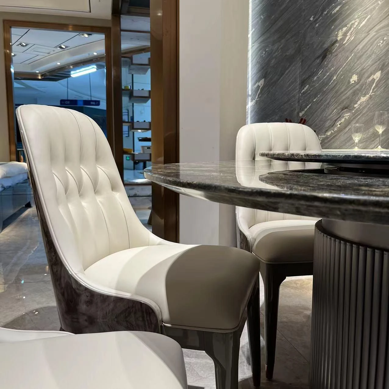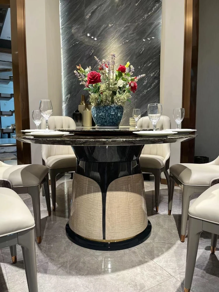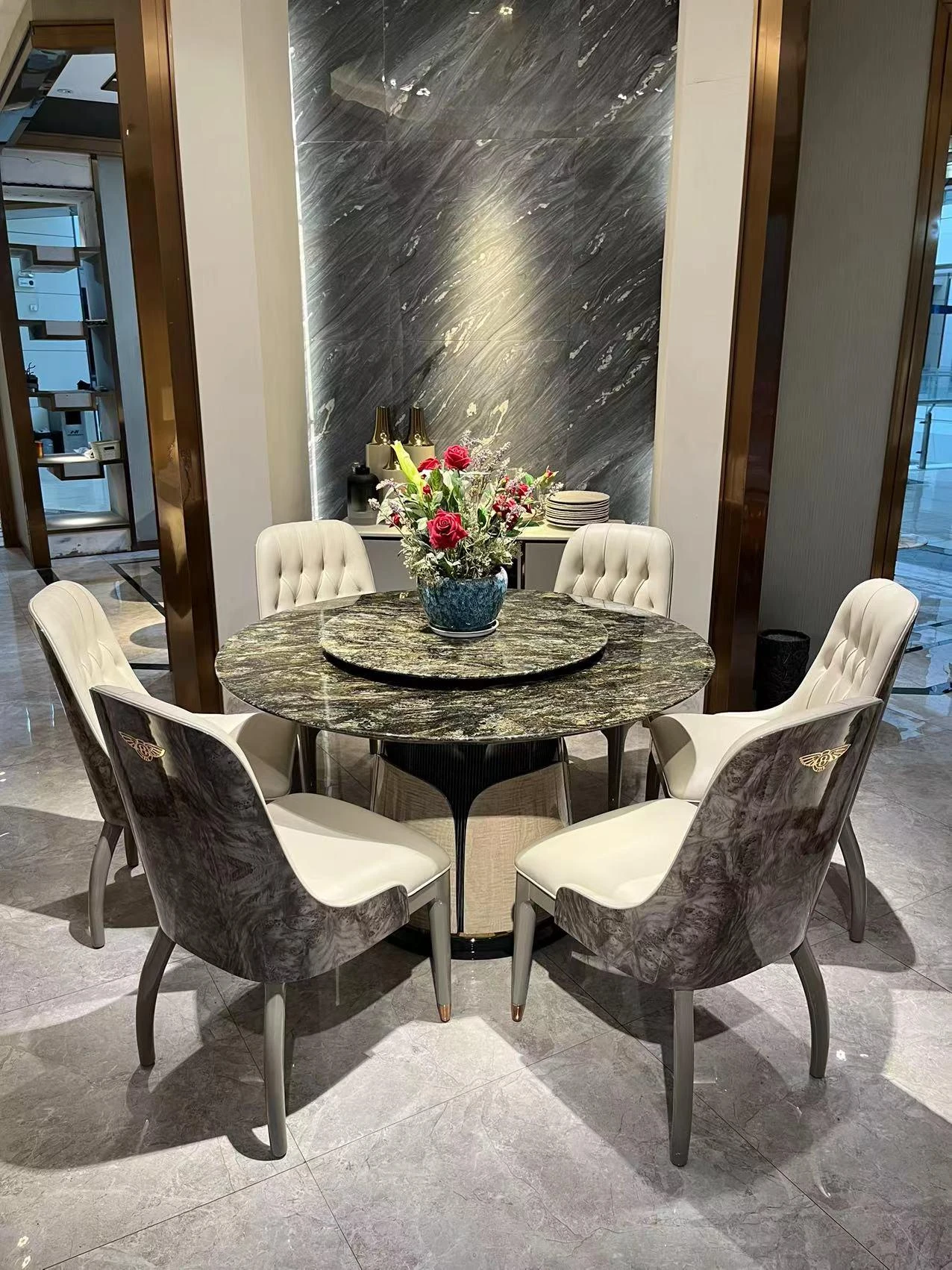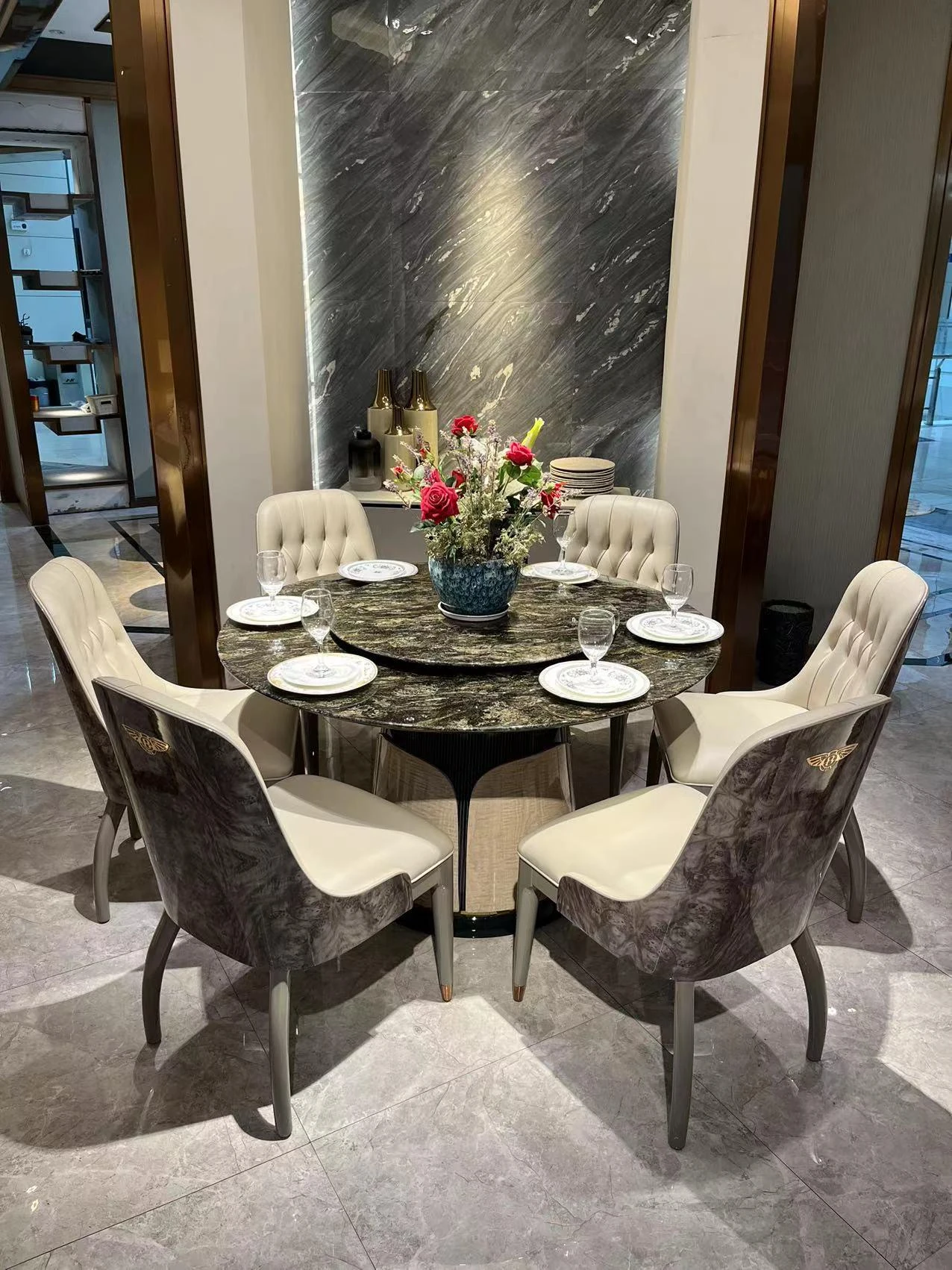 イタリアン・ラグジュアリー モダンデザイン 大型ラウンドテーブル 高級別荘向け エメラルドグリーンの天然石使用 豪華ダイニングテーブル&チェアセット