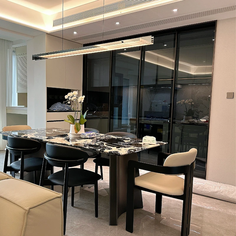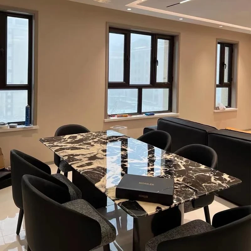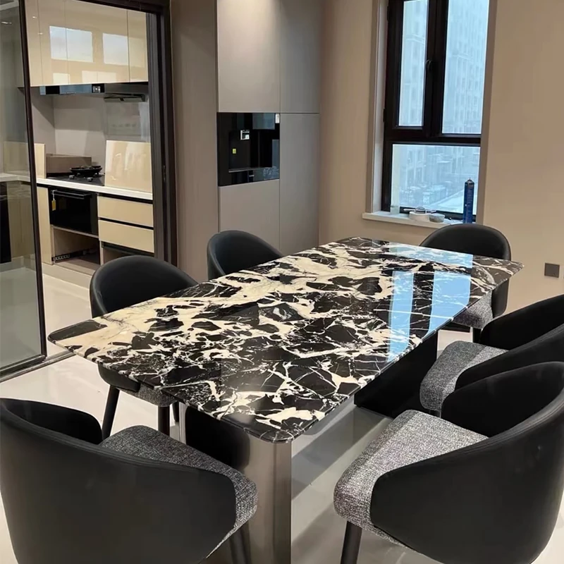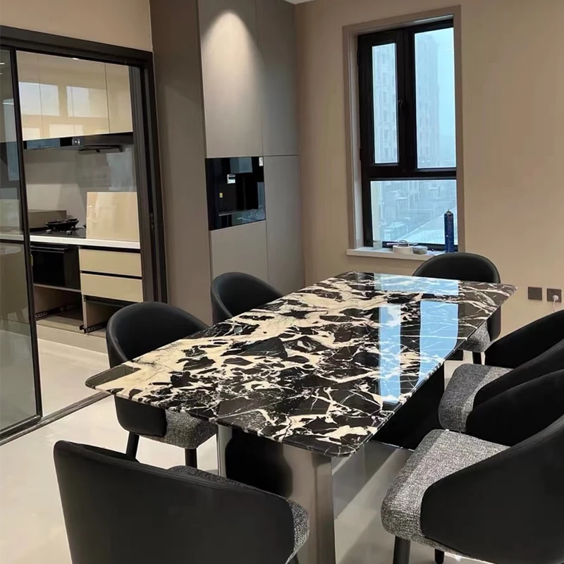 イタリアンラグジュアリー ナポレオンブラック大理石ダイニングテーブル - モダンな高級感溢れる長方形テーブル、家庭用に最適!洗練されたデザインで食卓を格上げし、特別なひとときを演出します。
