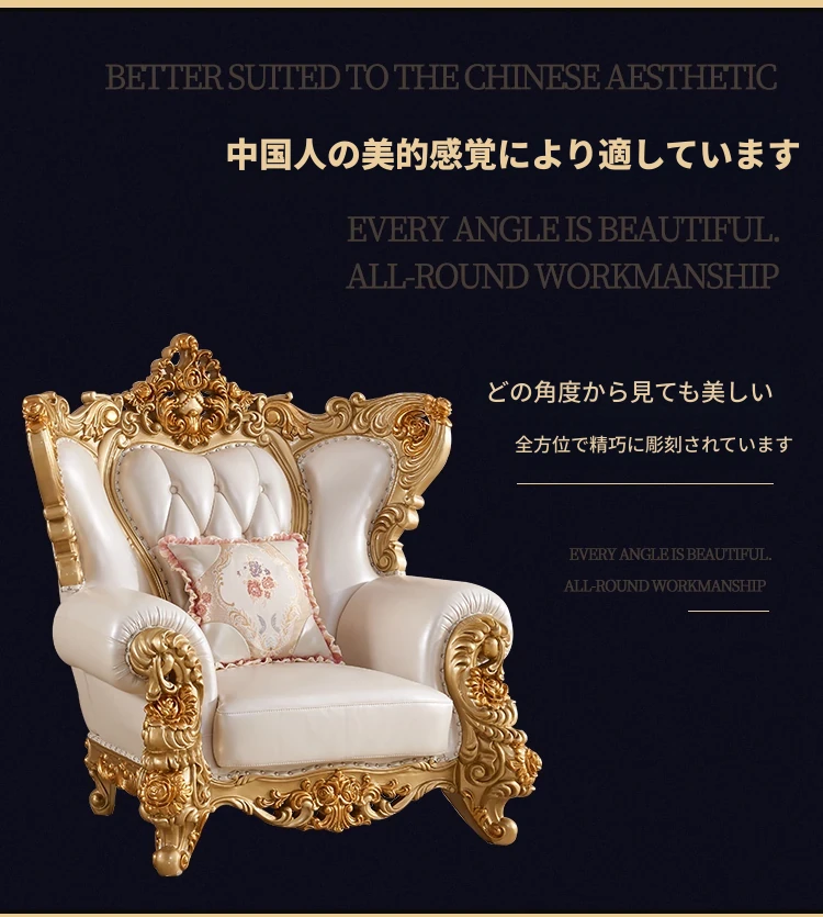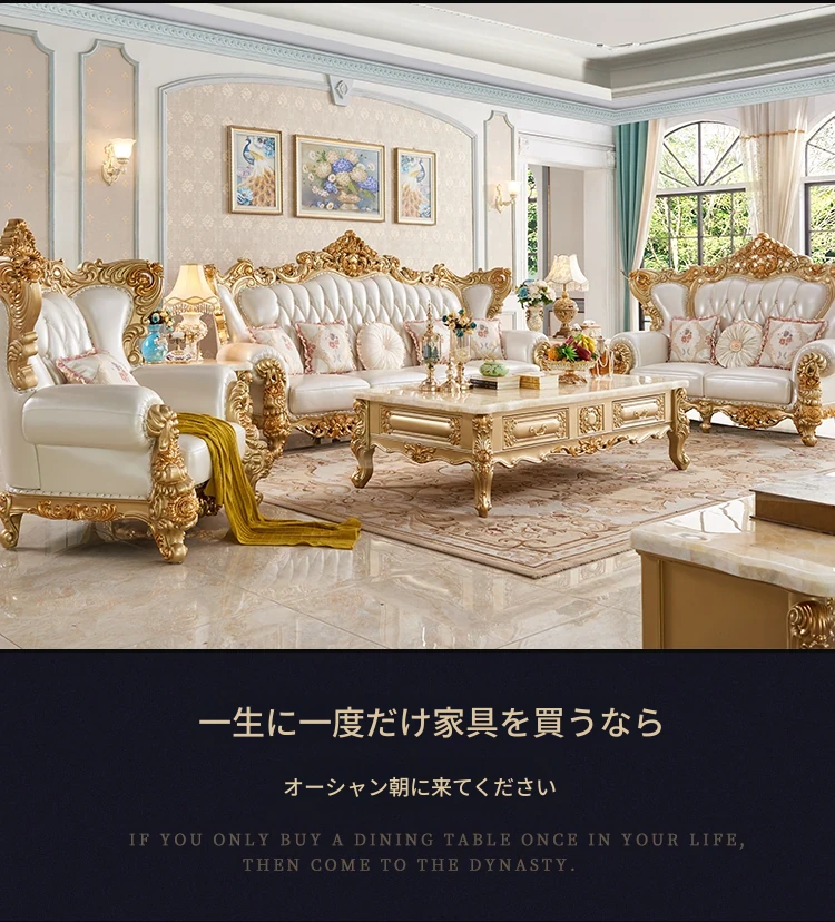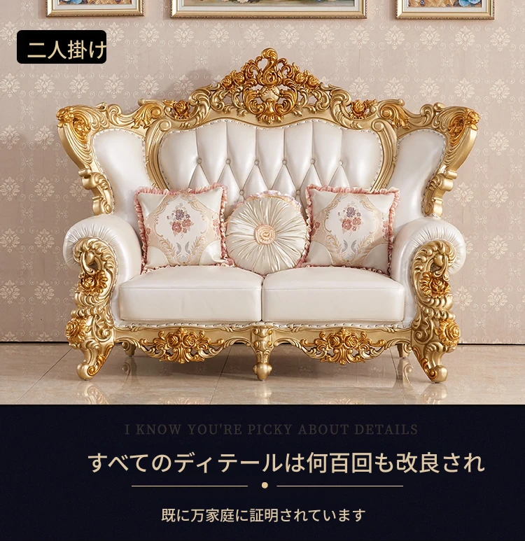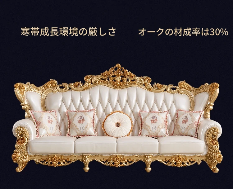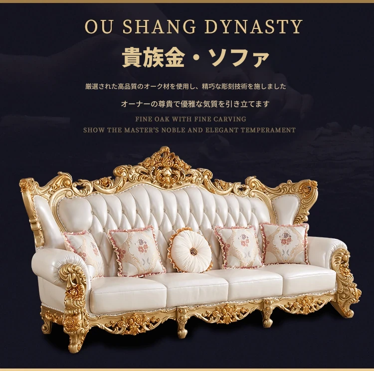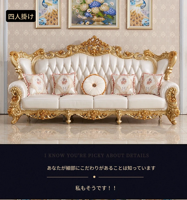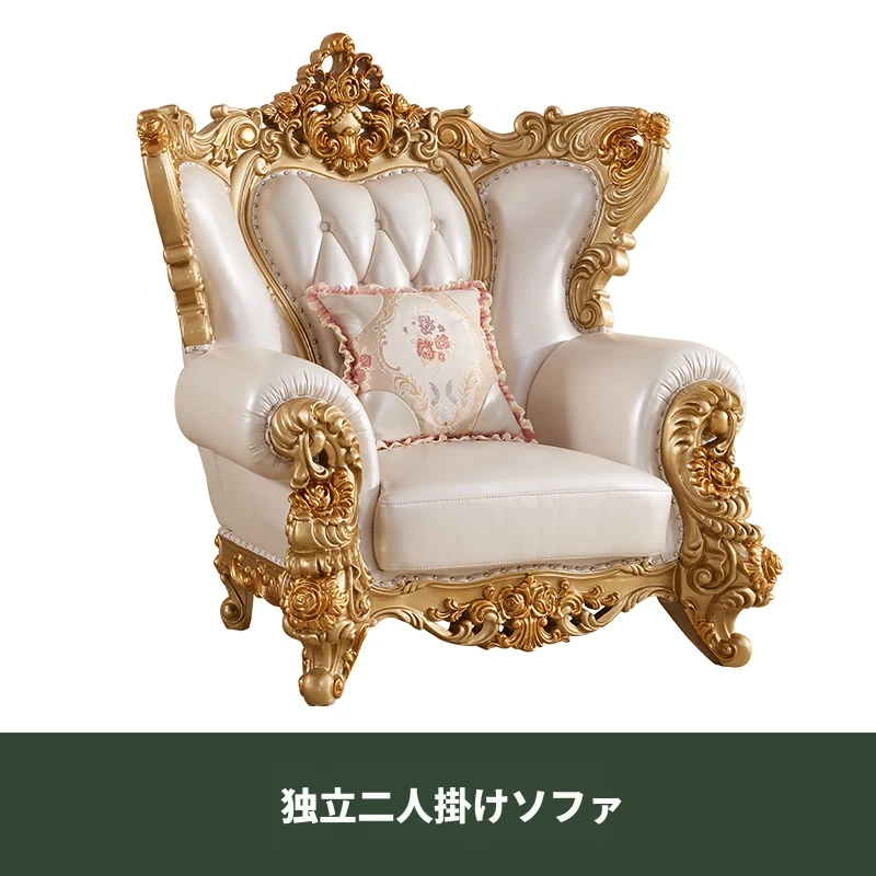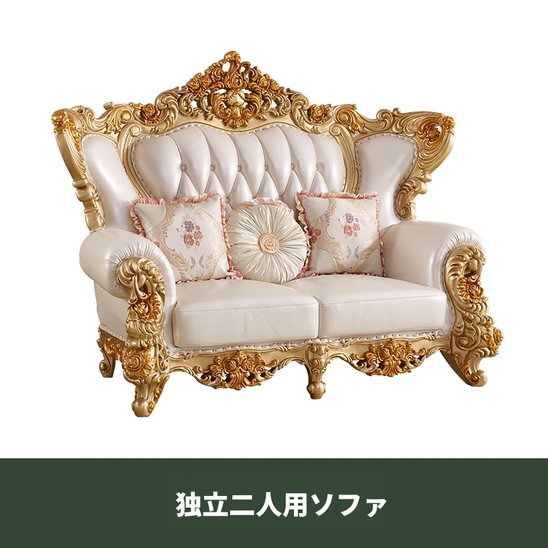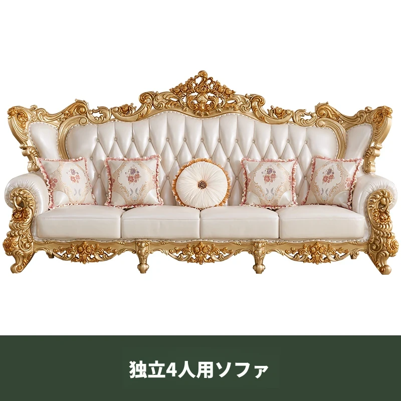 欧風本革&無垢材彫刻ソファ124コンビネーション - ゴージャスな金色で、どんなリビングにもぴったり!大中小さまざまな住宅やヴィラに最適な高級インテリア家具。