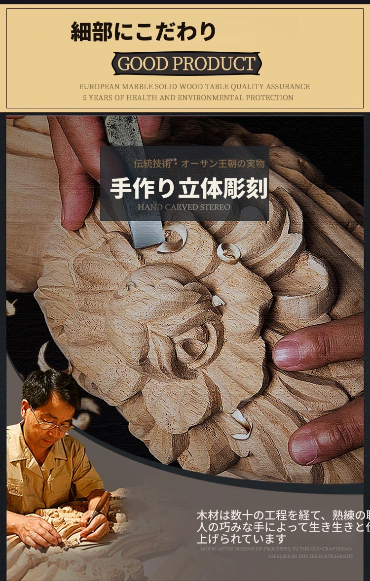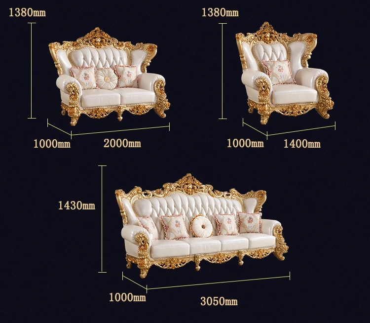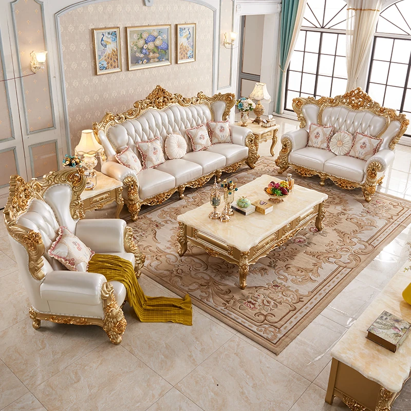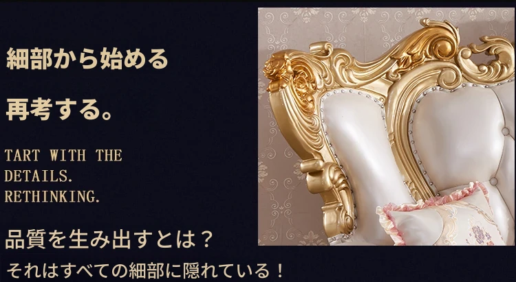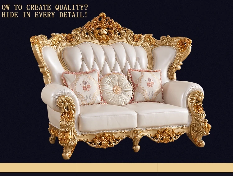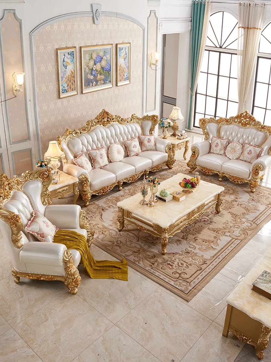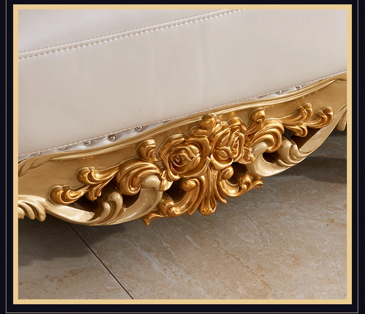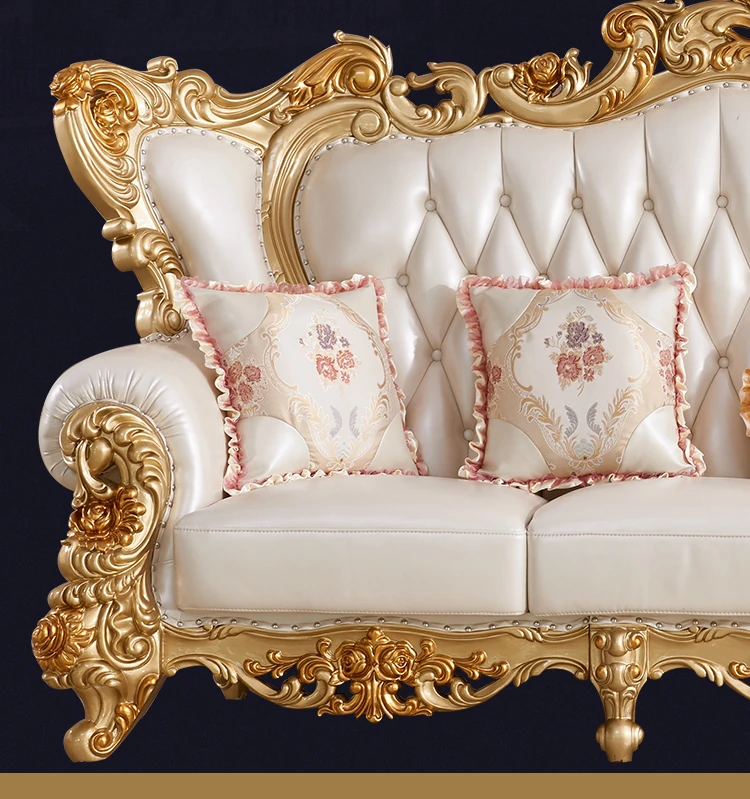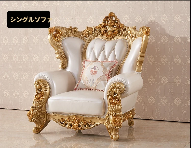 欧風本革&無垢材彫刻ソファ124コンビネーション - ゴージャスな金色で、どんなリビングにもぴったり!大中小さまざまな住宅やヴィラに最適な高級インテリア家具。