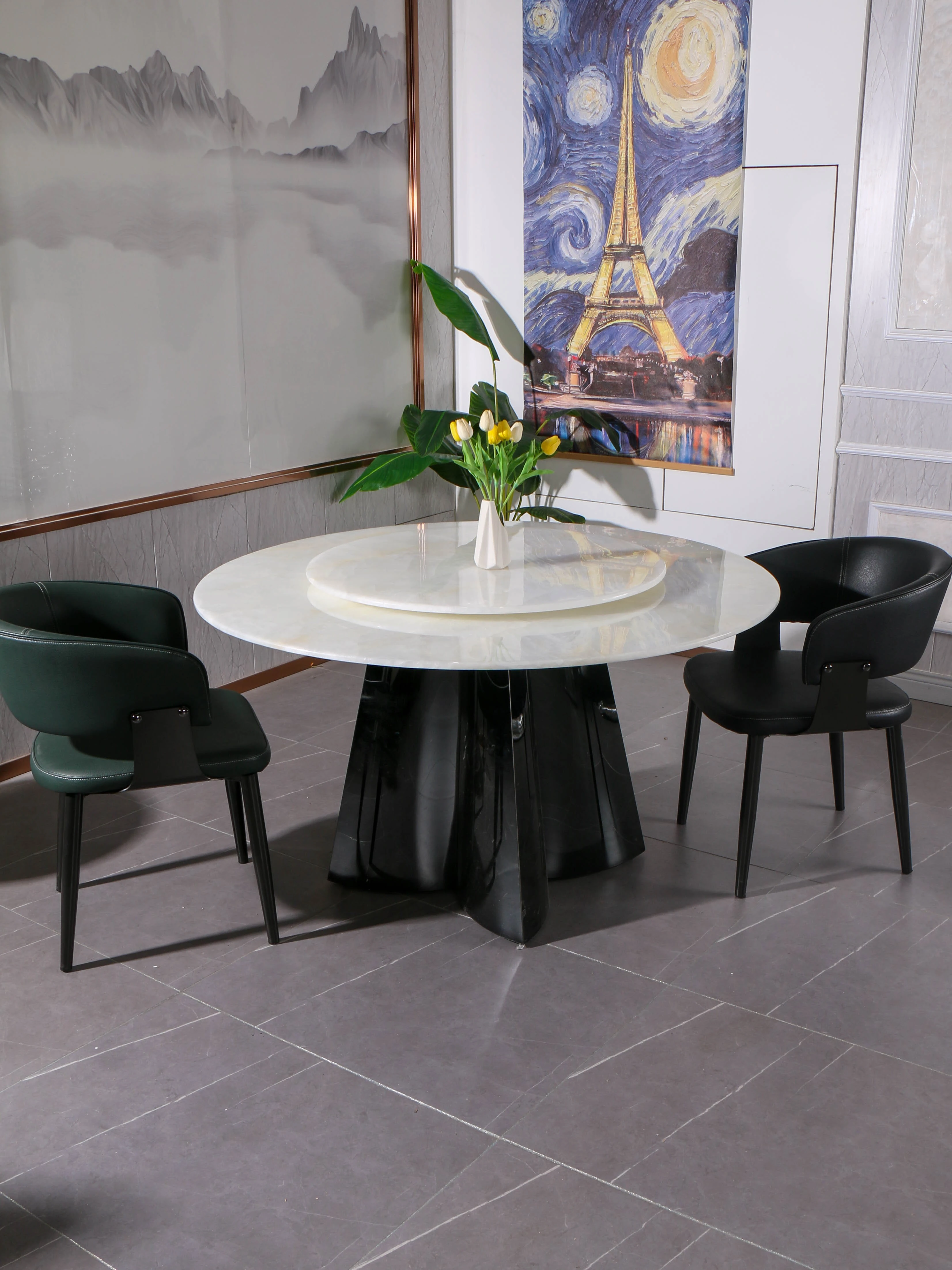 天然白玉翡翠贅沢石製ダイニングテーブル【回転盤付き】+ ラグジュアリーなダイニングチェア*12