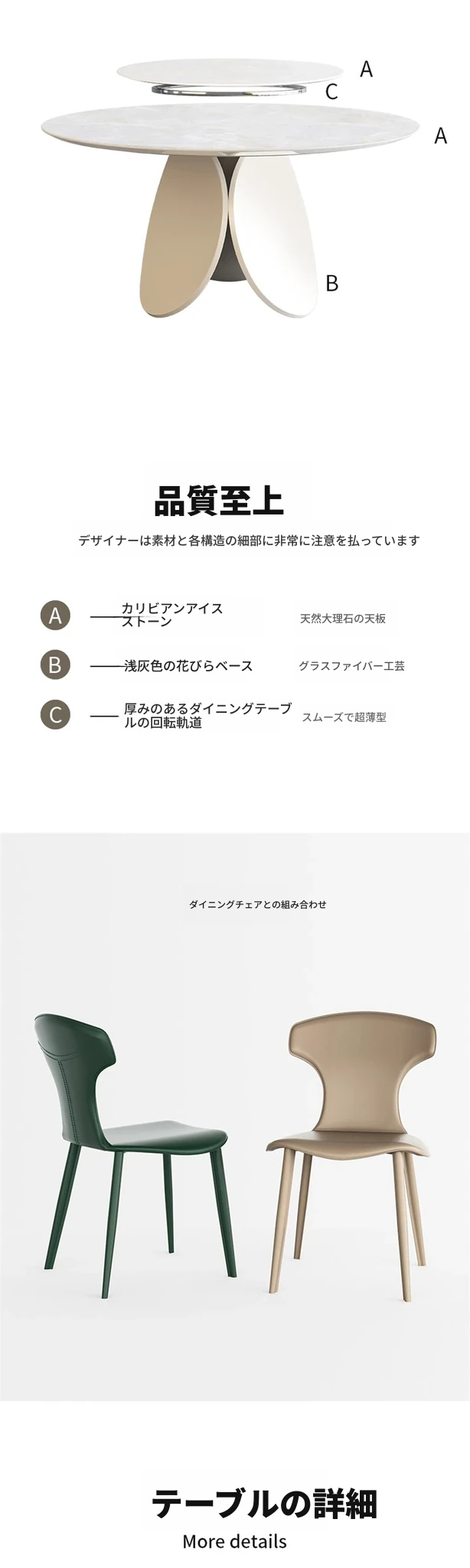 1.3Mカリアイス玉天然大理石【クリームホワイト花びら脚】回転盤付き