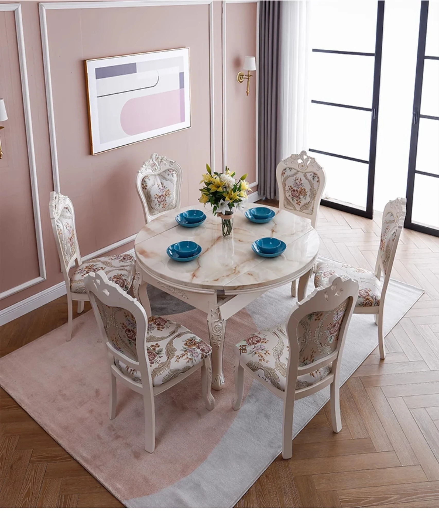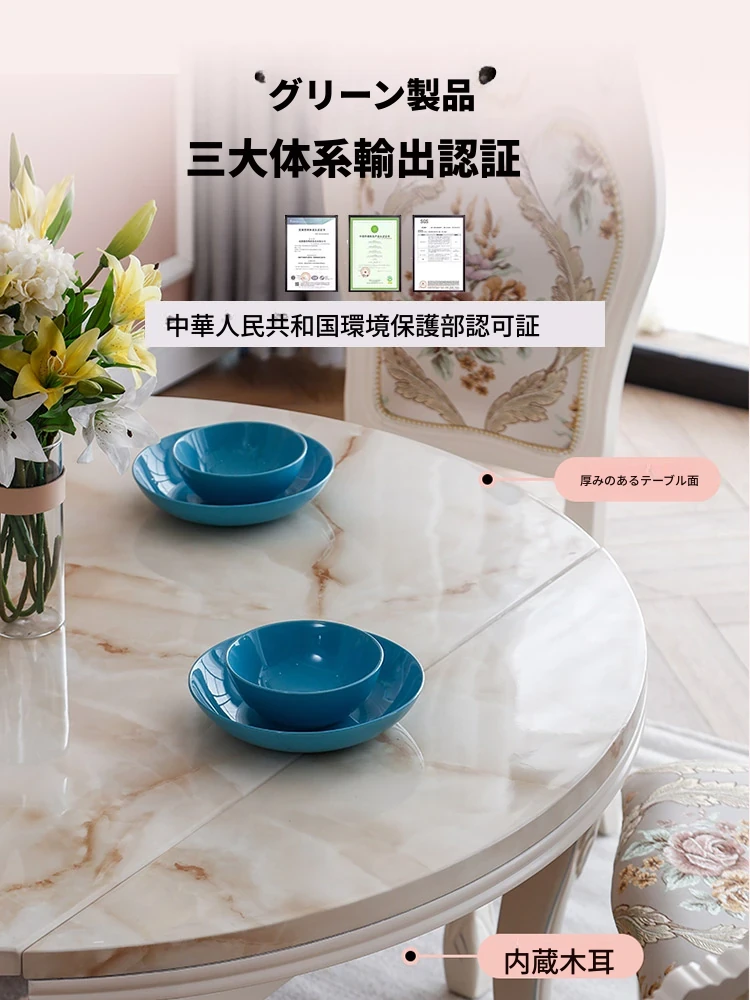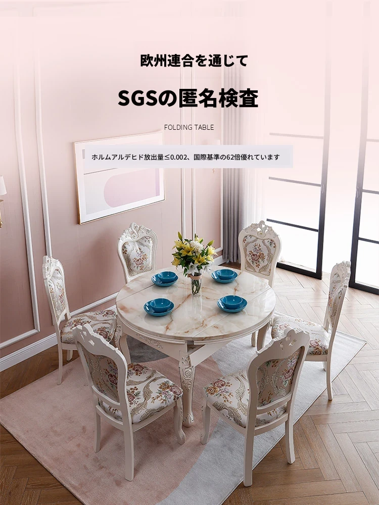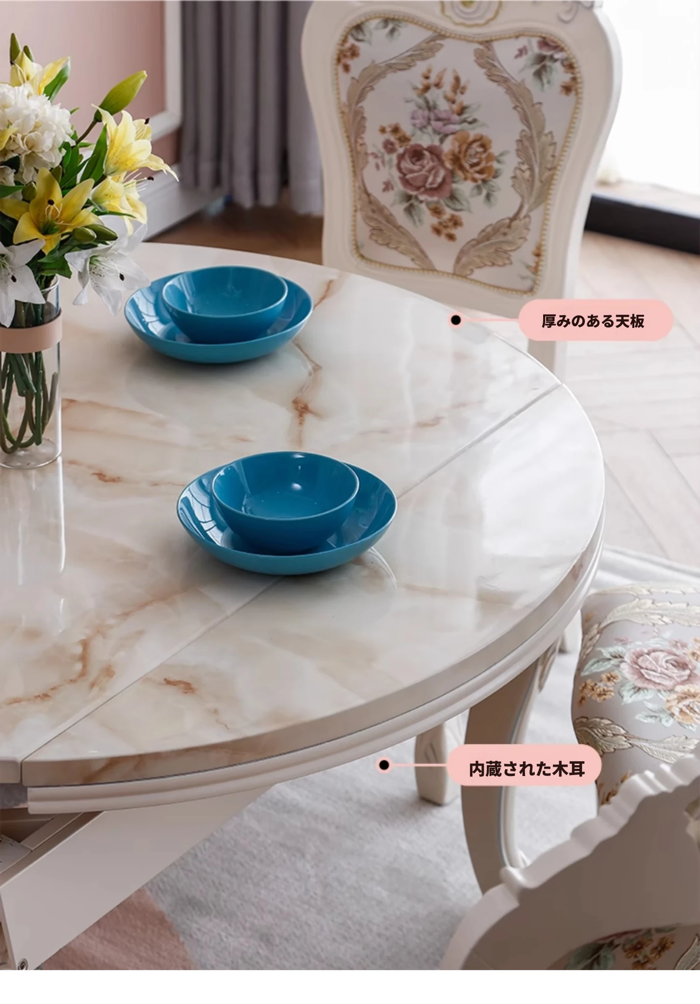 モダンでシンプルな欧式ダイニングテーブルセット!小さなスペースにもぴったりな実木と大理石の組み合わせ。伸縮式・折りたたみ可能な多機能ラウンドテーブルで、家族や友人との食事をより楽しく演出します!