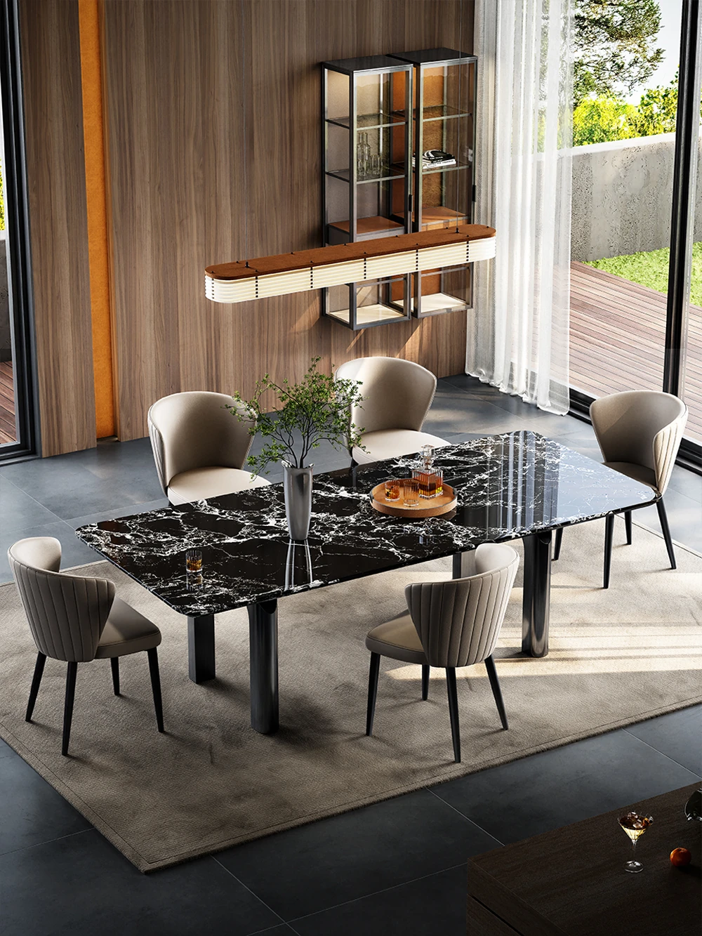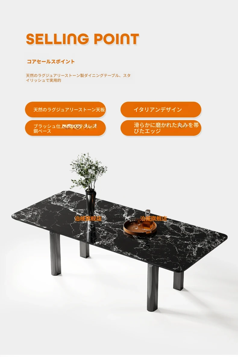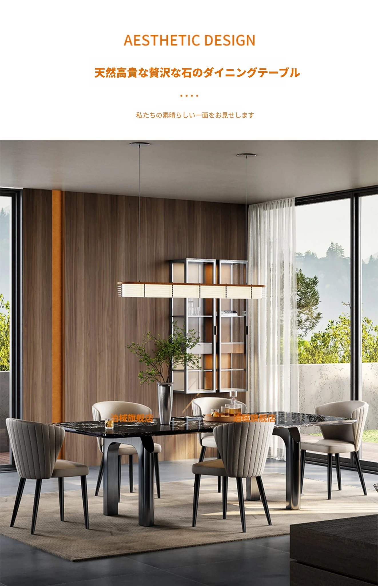 天然ブラックローズ石製モダンシンプル高級ダイニングテーブル&チェアセット - ヴィラにぴったりな長方形デザインで、贅沢な食事空間を演出します!