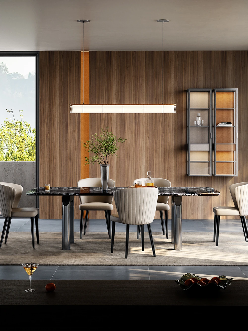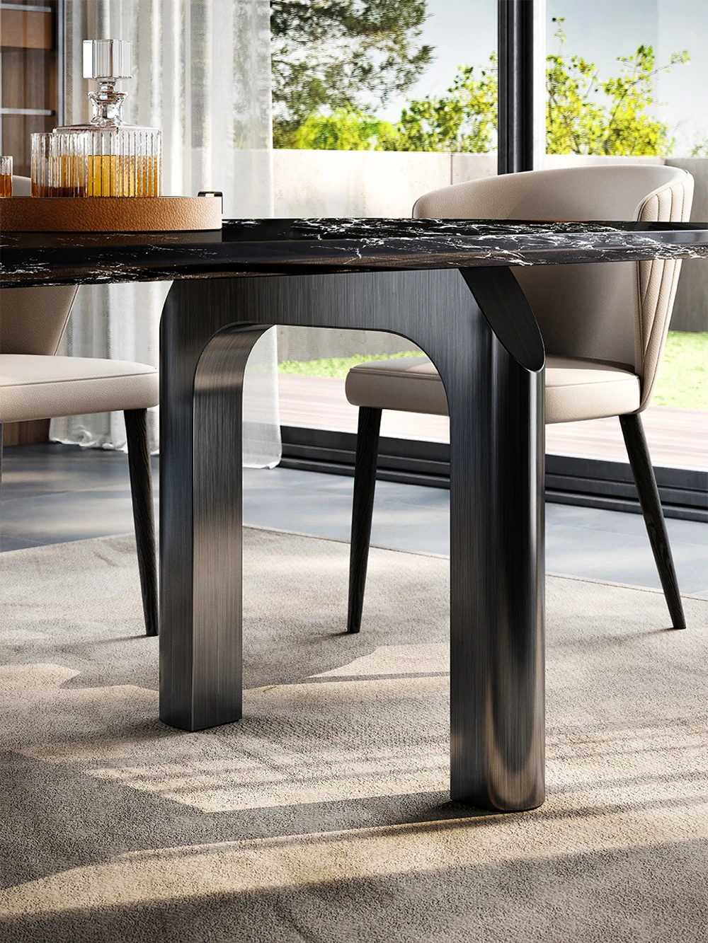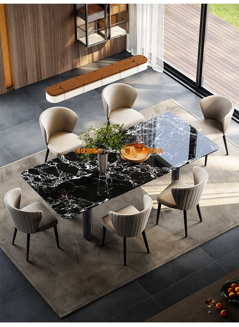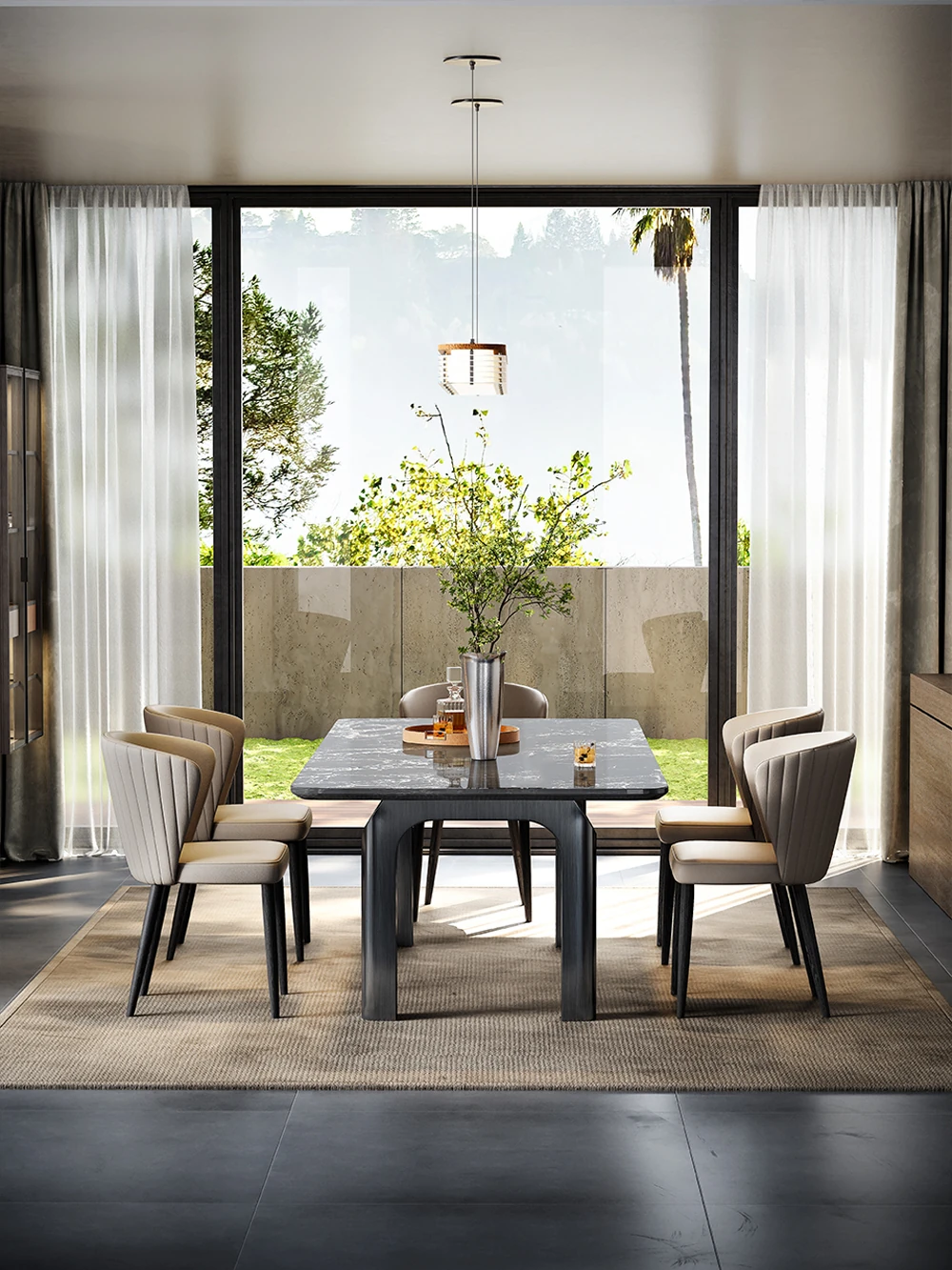 天然ブラックローズ石製モダンシンプル高級ダイニングテーブル&チェアセット - ヴィラにぴったりな長方形デザインで、贅沢な食事空間を演出します!