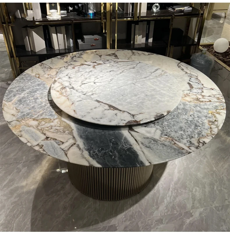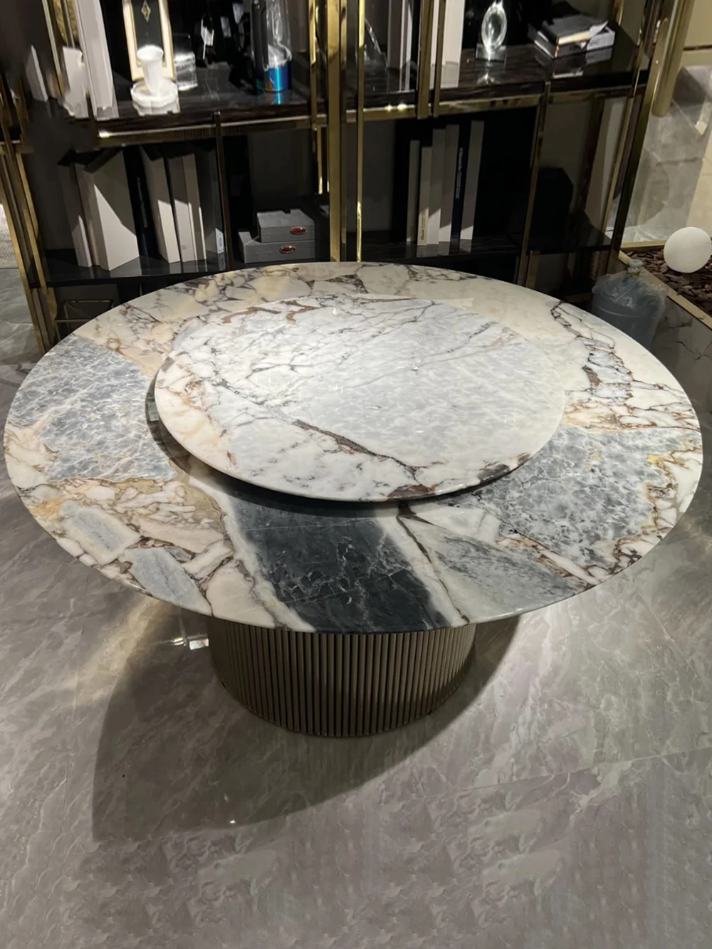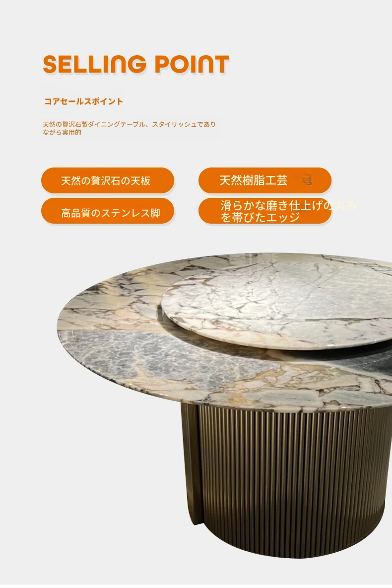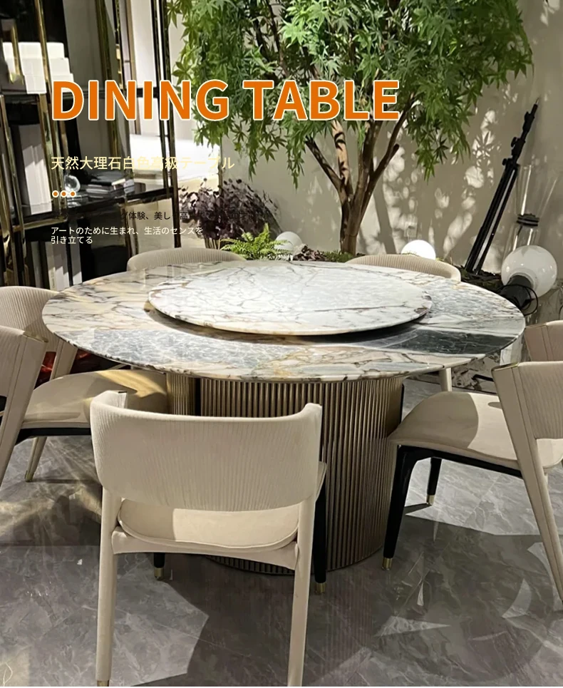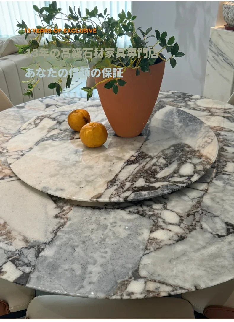 天然のエレファントホワイト大理石ダイニングテーブル - 高級感あふれるデザイナーズヴィラ向け、上質な家用円形テーブルで特別な食卓を演出。