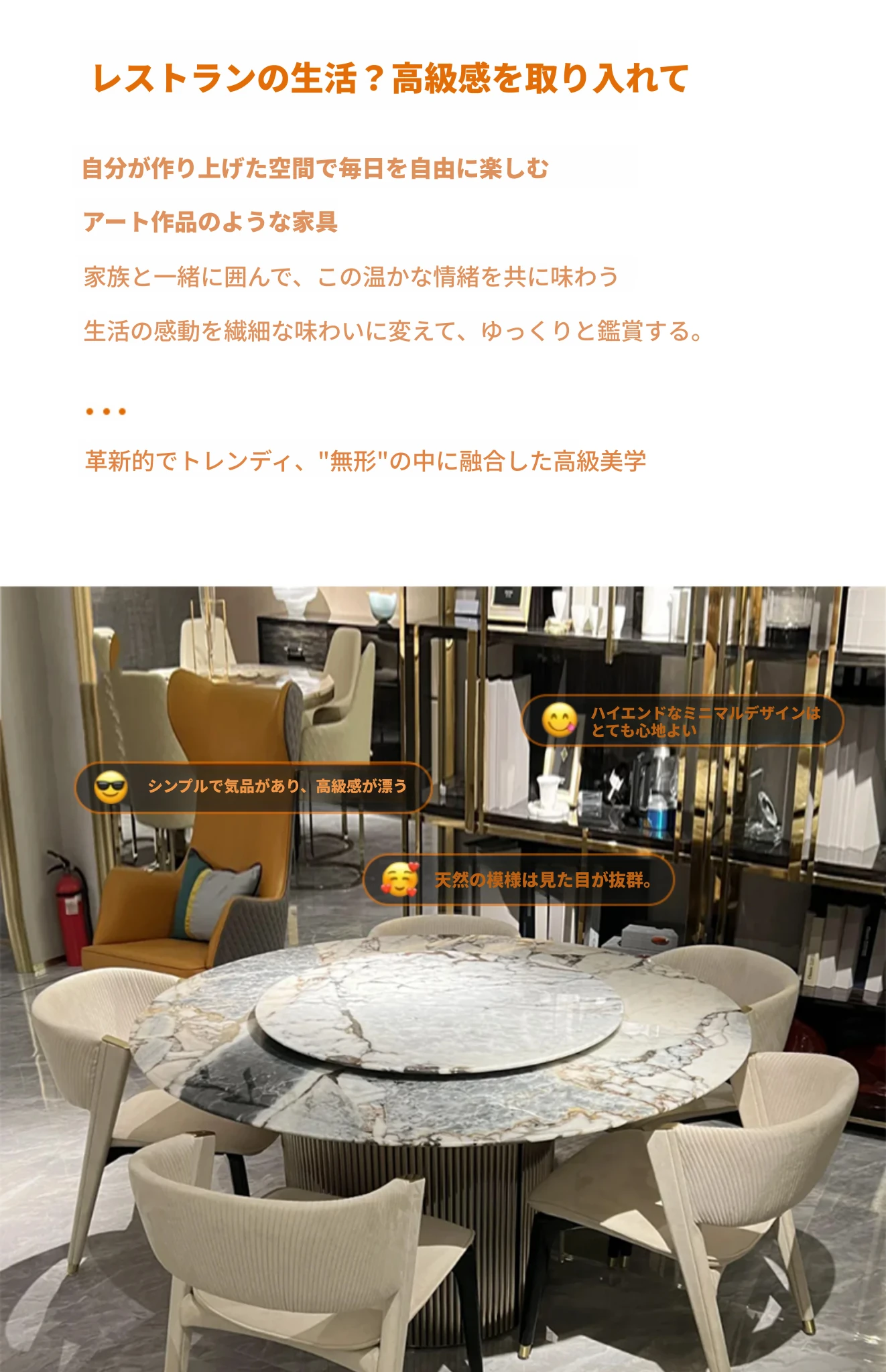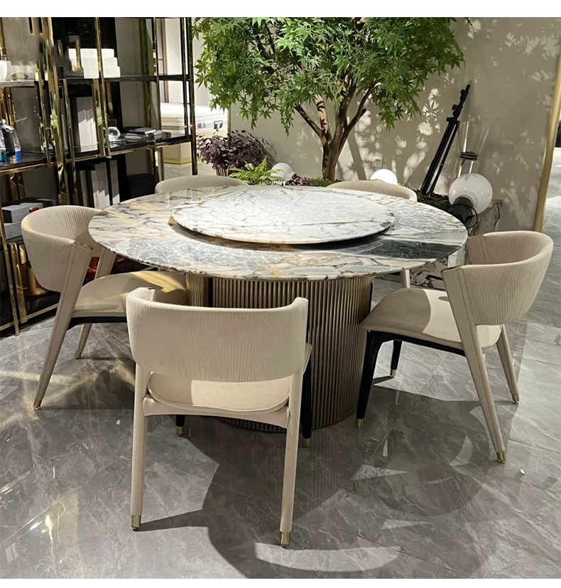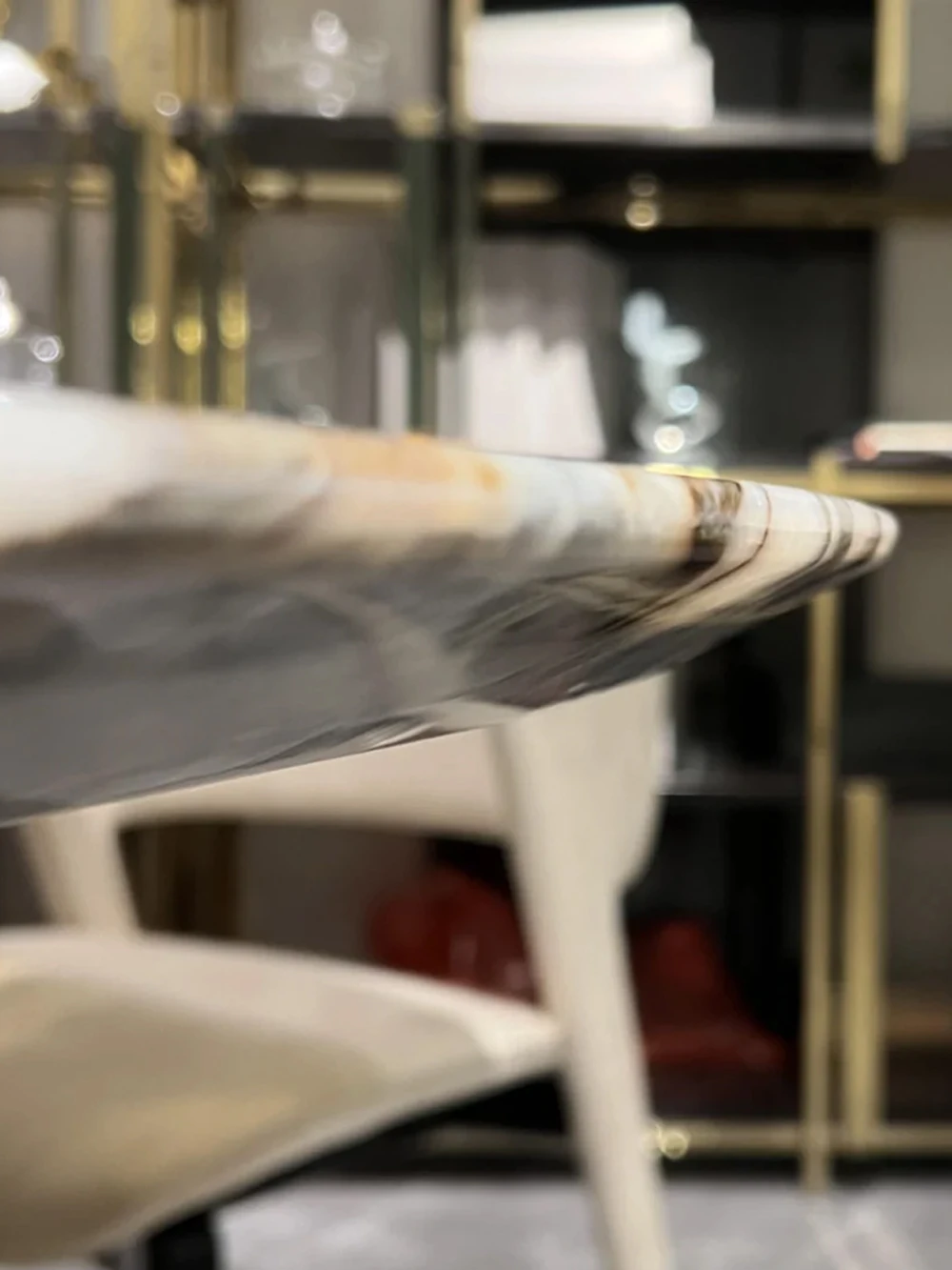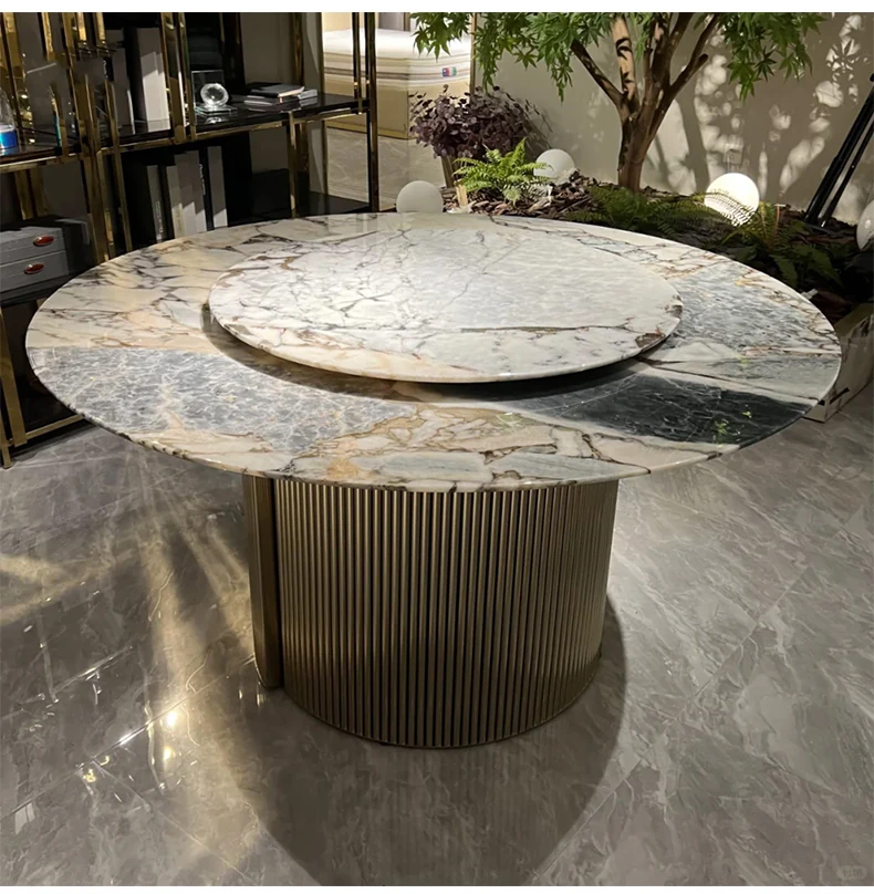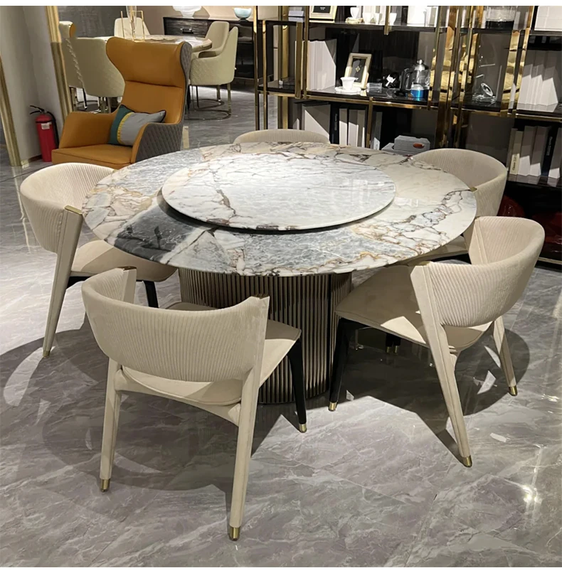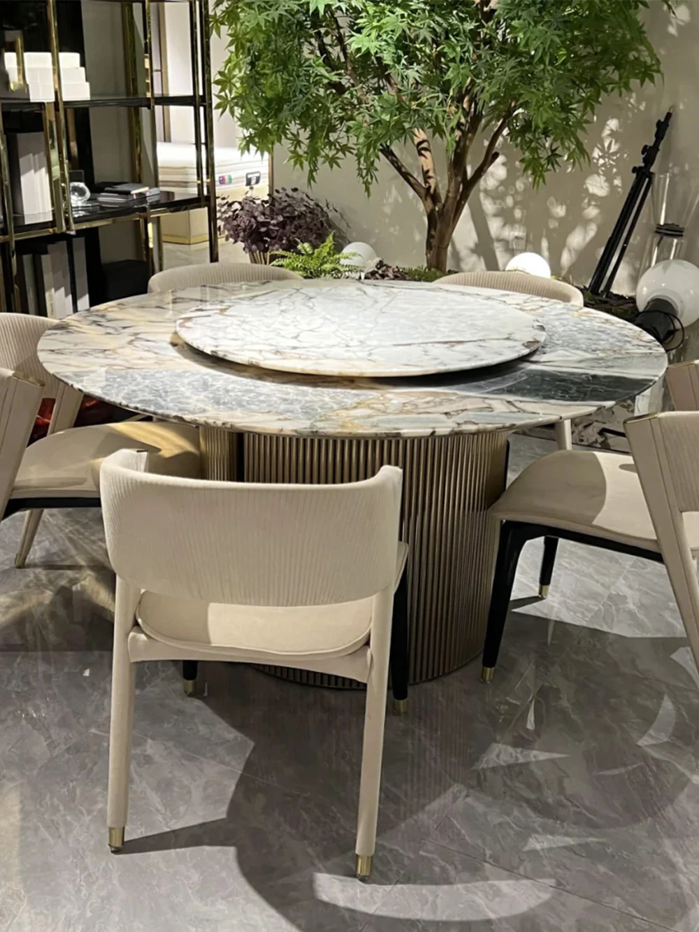 天然のエレファントホワイト大理石ダイニングテーブル - 高級感あふれるデザイナーズヴィラ向け、上質な家用円形テーブルで特別な食卓を演出。