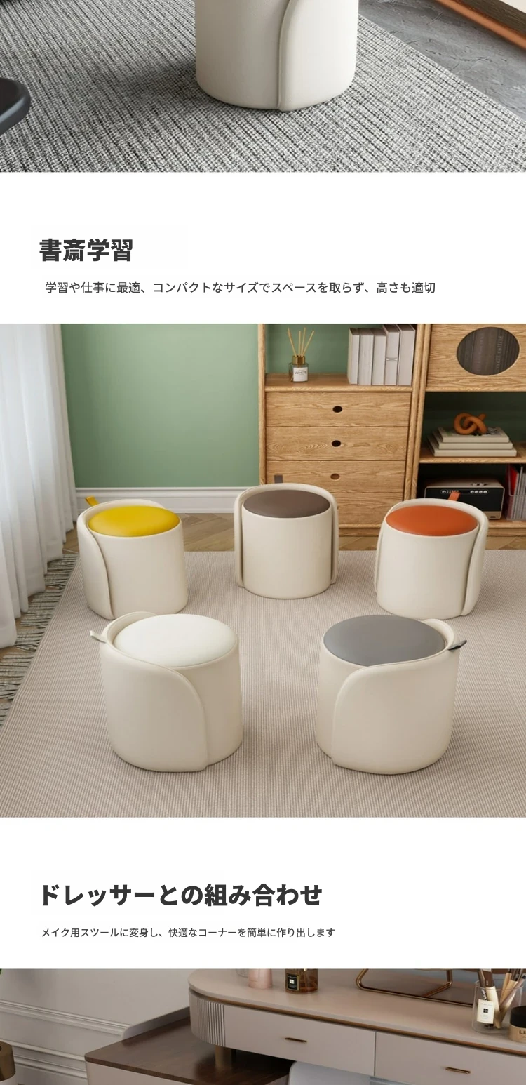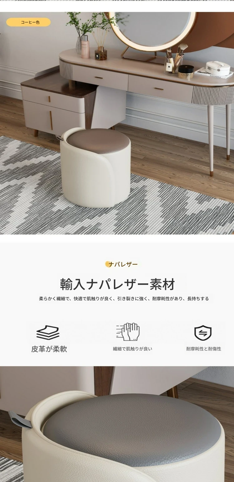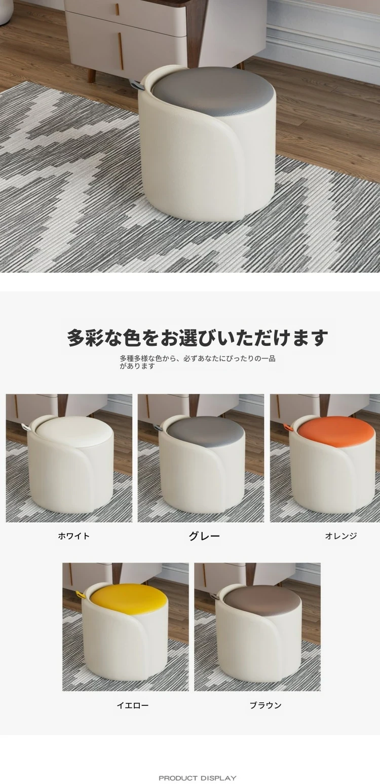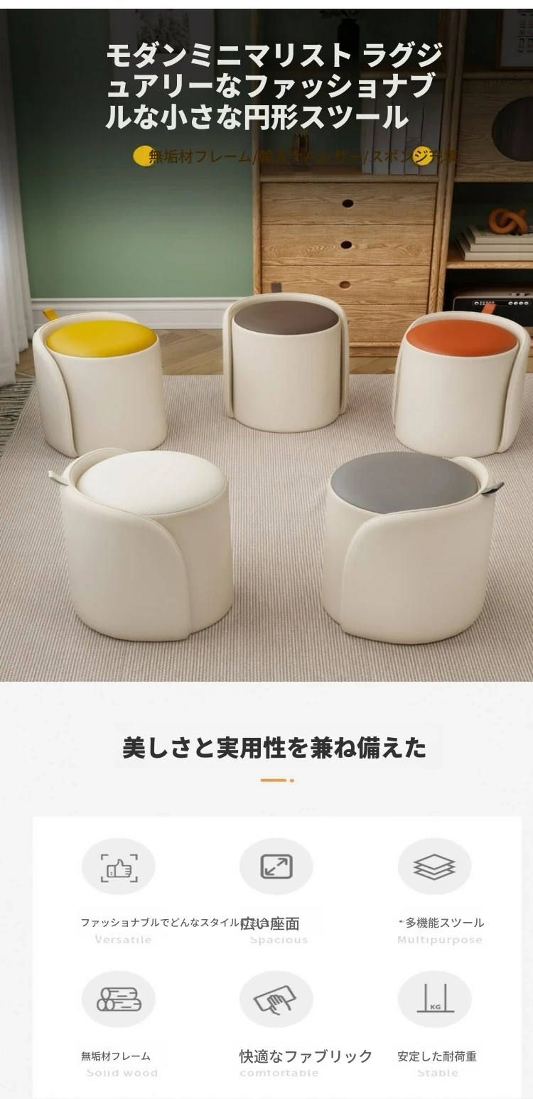 新作!軽やかでスタイリッシュな家用スツール - おしゃれな化粧椅子としても使えるミニマルデザインのラウンドレザー椅子。寝室やリビングのコーヒーテーブルの脇にぴったり!快適さとエレガンスを両立させた一品。