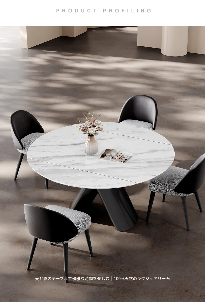 150cm角型から円型に変わるダイニングテーブル/100%天然素材のラグジュアリー石【ジャズホワイト】+セットの椅子*4