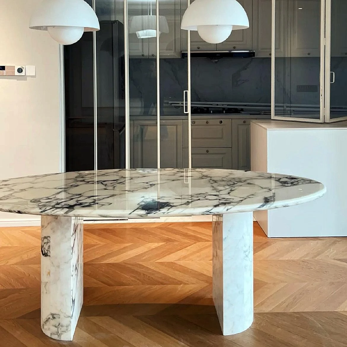 フランス風レトロ大理石ダイニングテーブル・馬腹型・高級ヴィラ向け・全大理石脚・魅惑の中古品!優雅な食卓を演出し、特別な時間をお楽しみください。