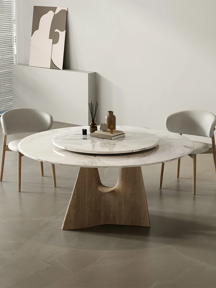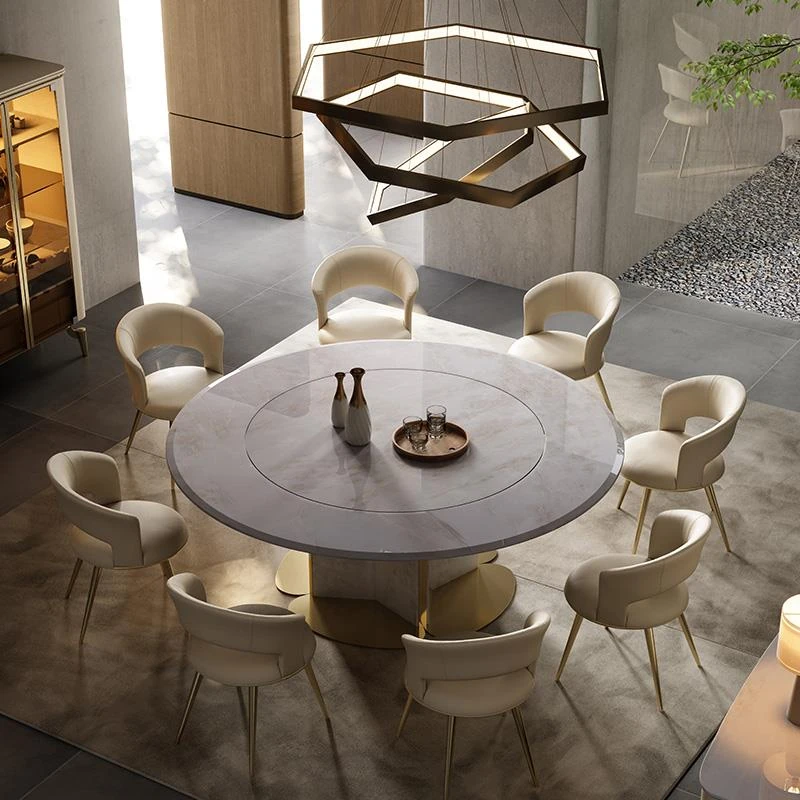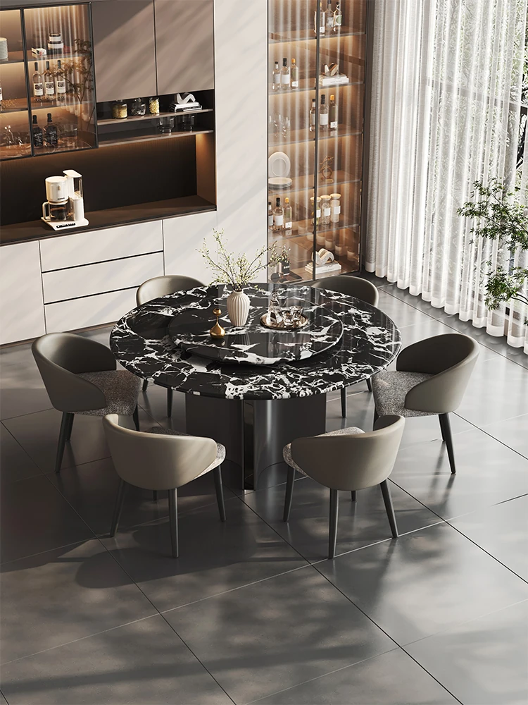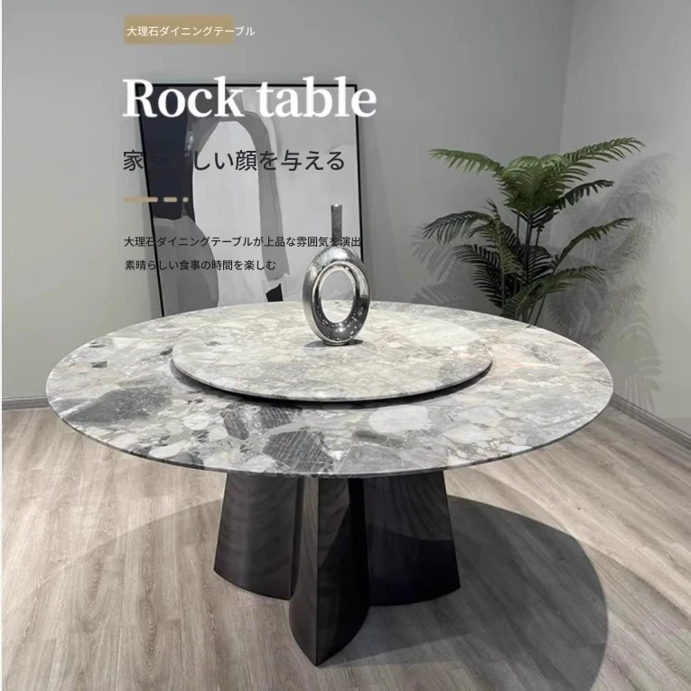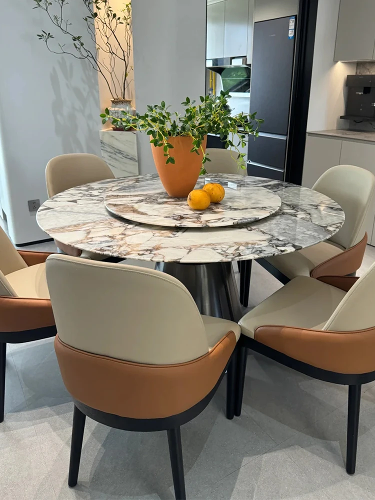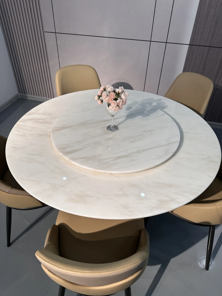ラグジュアリーな天然大理石の円形ダイニングテーブルセット - ヴィラスタイルのオリジナルデザイン、内蔵回転機能付きで、快適な食事体験を提供します。