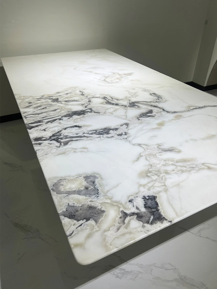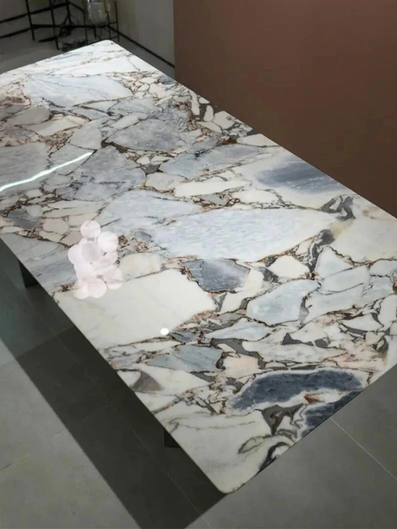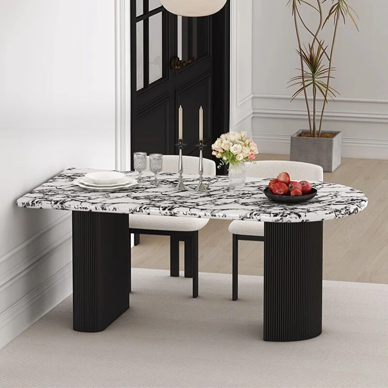 輸入天然大理石の贅沢なパンドラダイニングテーブル - 高級別荘向けのエレガントな長方形デザイン、上品で洗練された食事体験を提供します。
