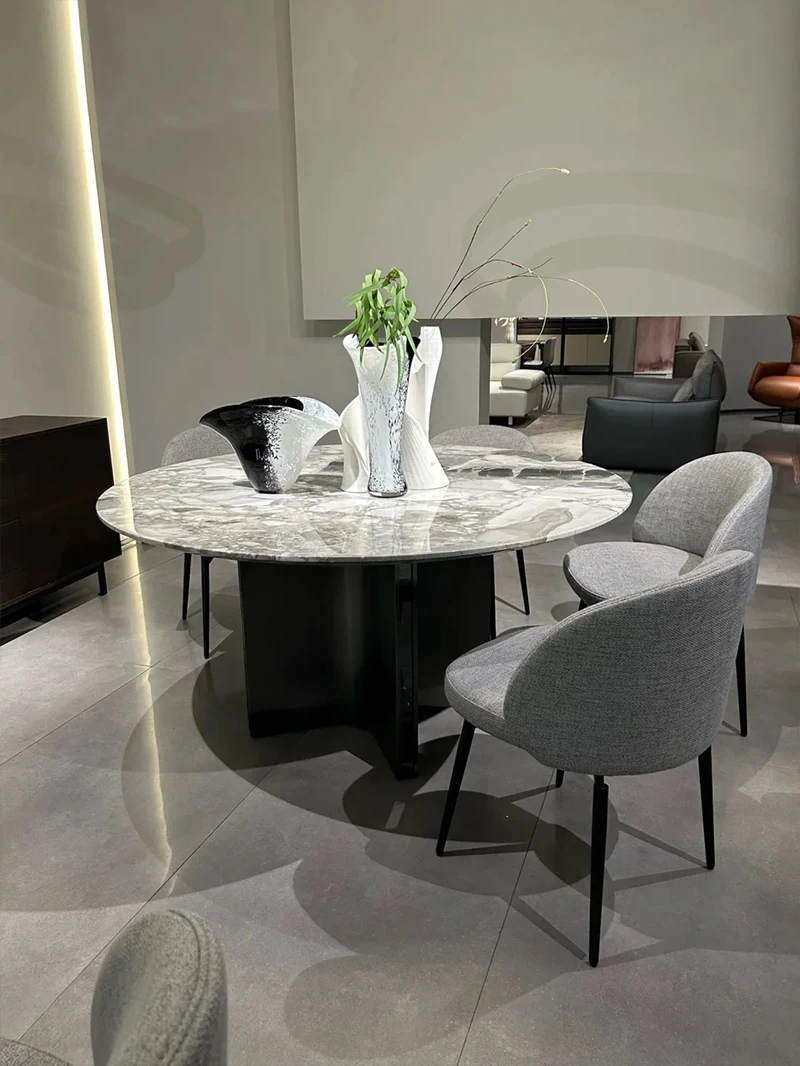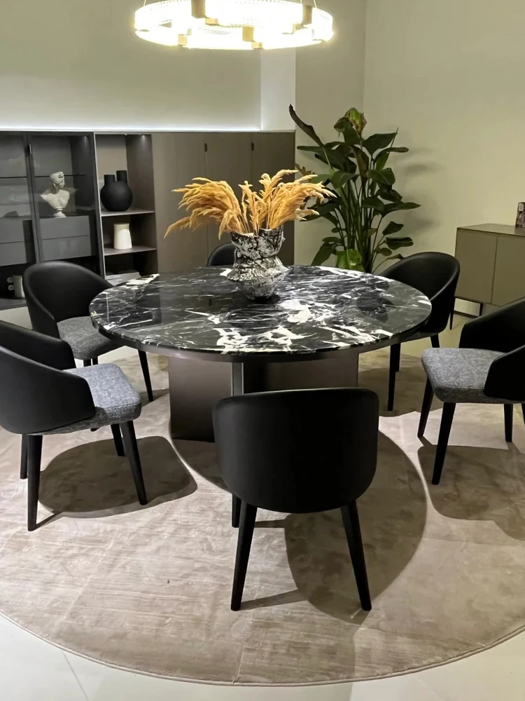 天然オリオグレー高級大理石ダイニングテーブルセット - 現代的でシンプルなラグジュアリー、円形デザインで別荘にもぴったりの贅沢な食事空間を演出!