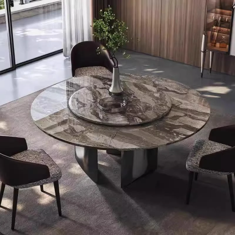 純天然ラグジュアリーオリオグレー大理石ラウンドダイニングテーブル - シンプルで高級感あふれる別荘用、回転プレート付き!