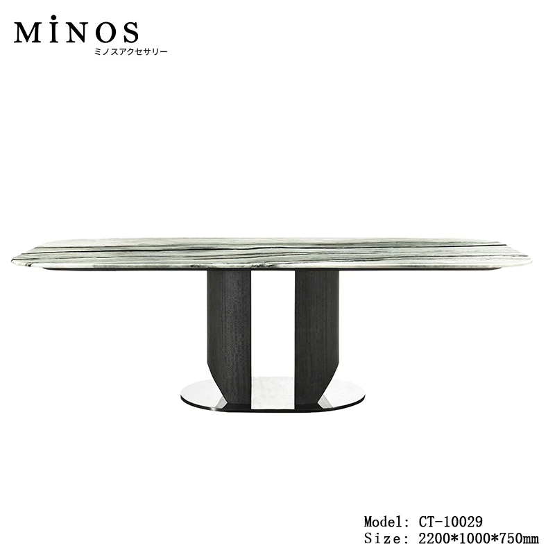 ナチュラルグリーンの大理石と無垢材を使用した長方形ダイニングテーブル - イタリアンスタイルの軽やかなラグジュアリーを演出するモダンなデザイン。食卓に洗練された美しさを添えます!