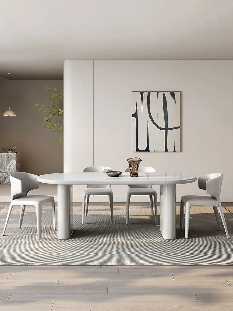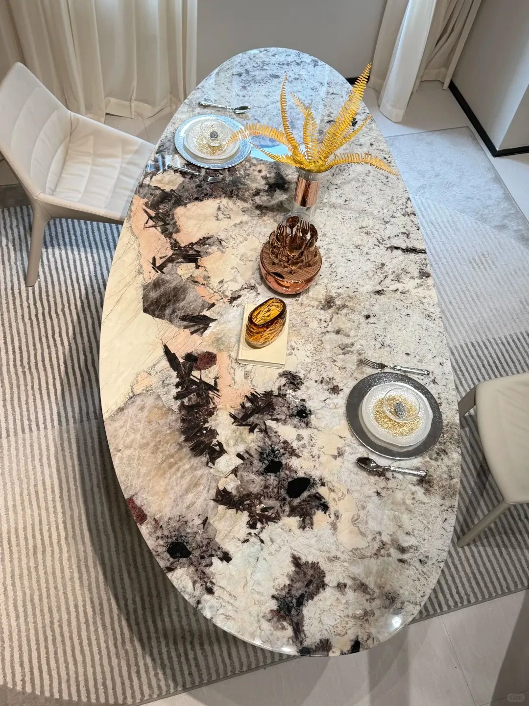 彼愛の高級感あふれるフランス風クリーム色の輸入大理石オーバルダイニングテーブル - モダンでシンプルなデザイン、優雅な食卓を演出します!