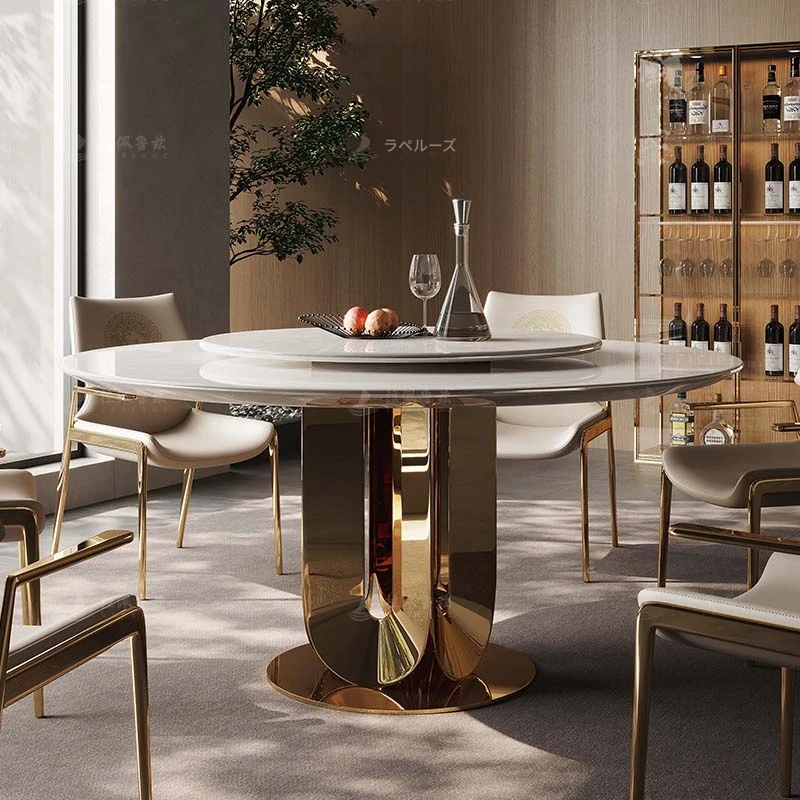 軽やかなラグジュアリー、ステンレス製の丸型ダイニングテーブル。モダンなデザイン、大理石の天板と回転トレイ付き。小さなスペースでも使いやすい、家庭向けのテーブルと椅子のコンビネーション。